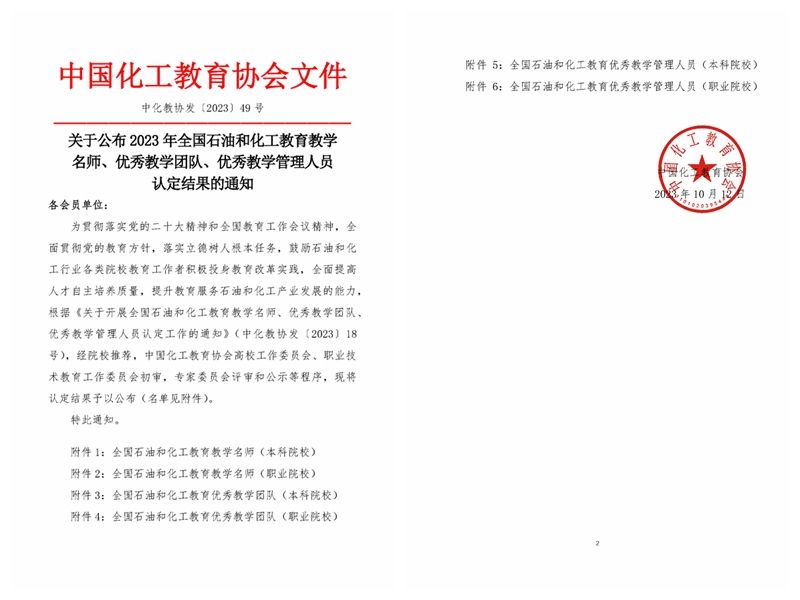 10月12日,中國(guó)化工教育協(xié)會(huì)公布了2023年全國(guó)石油和化工教育教學(xué)名師、優(yōu)秀教學(xué)團(tuán)隊(duì)、優(yōu)秀教學(xué)管理人員認(rèn)定名單,我校化工學(xué)院蘇瓊教授獲得“全國(guó)石油和化工教育教學(xué)名師”榮譽(yù)稱號(hào)。