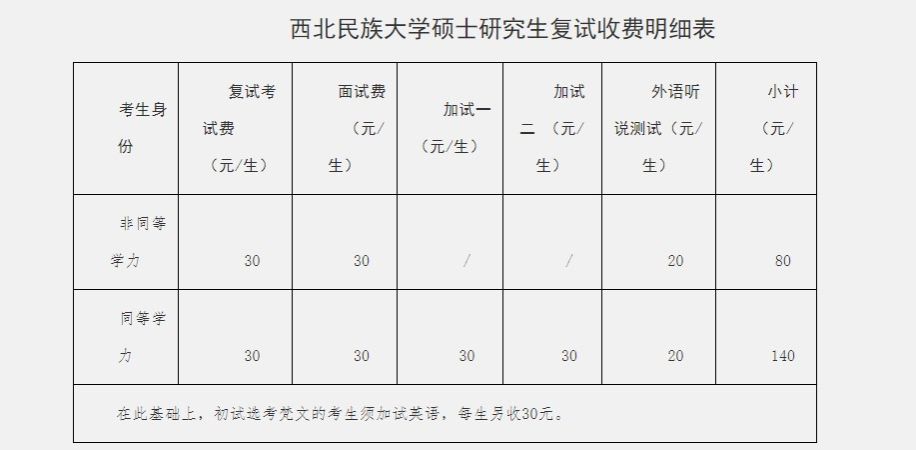 通過資格審查的考生須按《甘肅省發(fā)展和改革委員會、甘肅省財政廳關(guān)于大中專院校招生報名費等收費標準的批復》(甘發(fā)改收費〔2010〕1915號)要求繳納復試費,具體收費標準見下表: