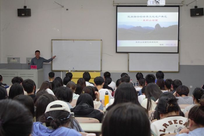 活動中,麥積山石窟藝術研究所副所長張銘博士首先以《民族融合的世界文化遺產典范——麥積山石窟》為題,以麥積山石窟歷史發展為縱軸,從“天水歷史文化概述”“麥積山石窟中的民族融合”“天水地區其他石窟中的民族融合”“石窟寺類文化遺產的當代價值”四方面,向現場300余名師生生動介紹了“石窟文化”的歷史發展過程、“麥積山石窟藝術”的民族融合特征,宣傳石窟里的鑄牢故事,闡釋隴原大地上的“團結基因”,展示麥積山石窟藝術無與倫比的文化魅力,揭開了麥積山石窟美麗而神秘的面紗。