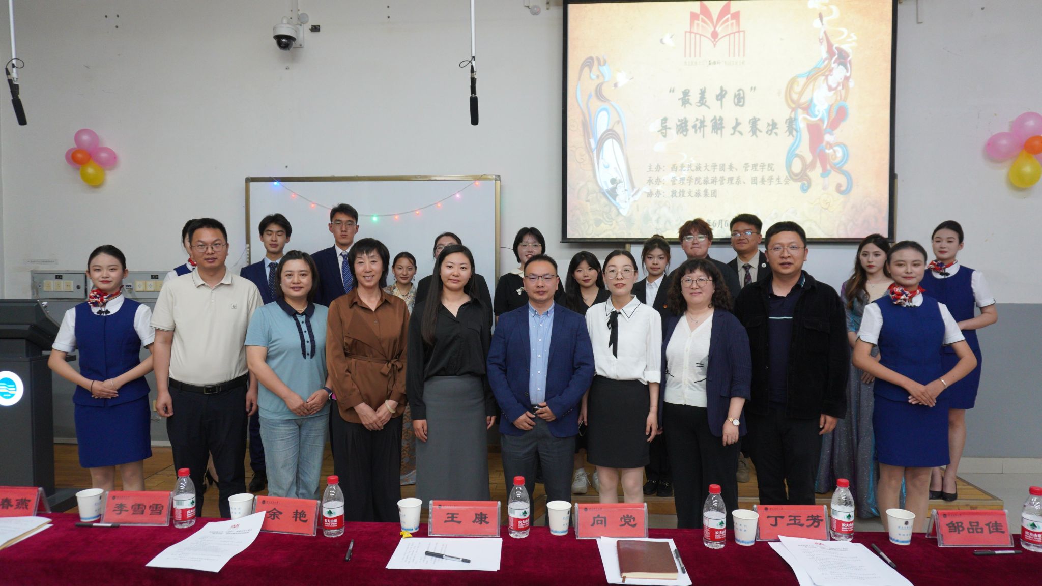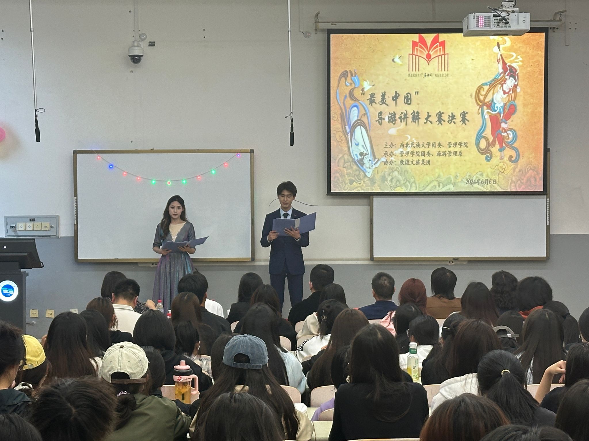 6月6日晚,由校團委、管理學院主辦,敦煌文旅集團協辦的西北民族大學“石榴籽”校園文化工程之“最美中國”導游講解大賽決賽在榆中校區致真樓105室成功舉辦。大賽特邀敦煌市鳴沙山月牙泉旅游發展有限公司游客接待部經理李雪雪,講解組高級講解員余艷,學校團委副書記王康,管理學院黨委書記向黨,管理學院黨委副書記、副院長丁玉芳,旅游管理系主任鄒品佳博士,航空服務藝術與管理系主任付春燕博士擔任評委,150余名師生現場觀看決賽。