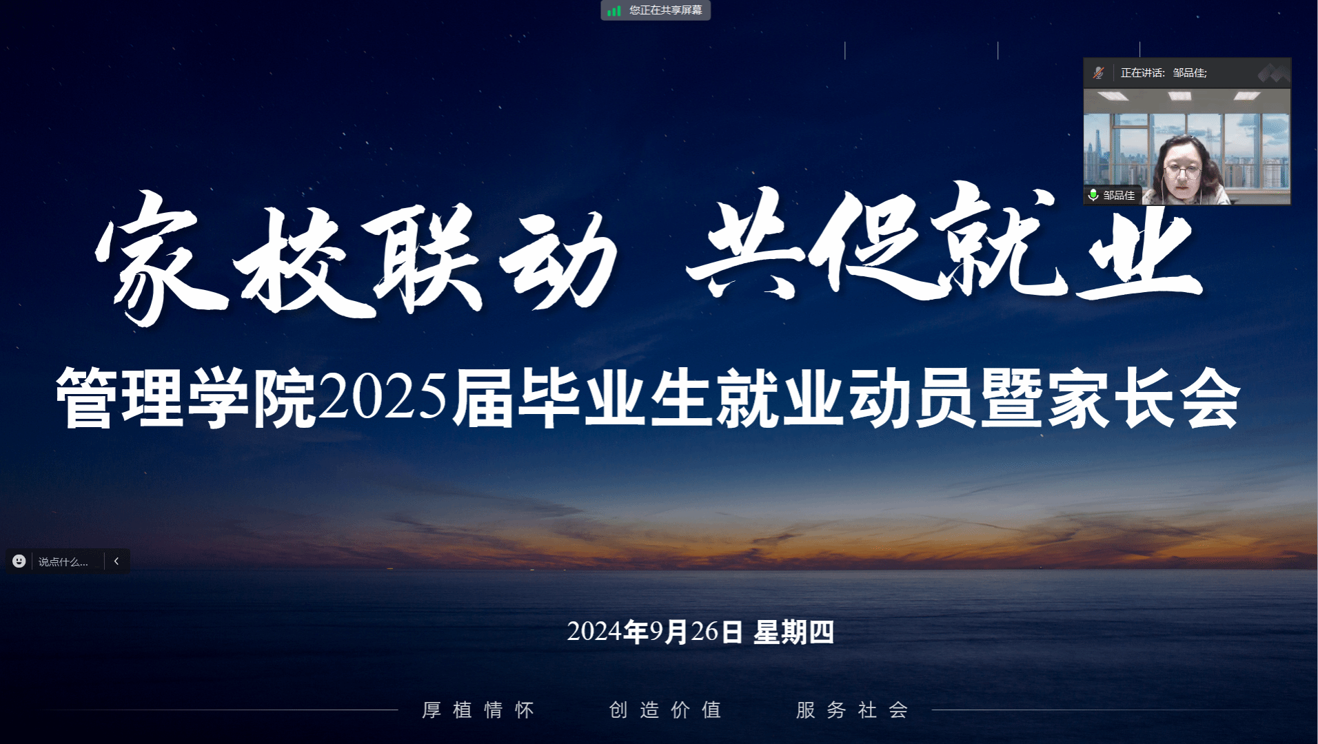 為發(fā)揮家校協同育人作用,共同答好就業(yè)題,一起促進2025屆畢業(yè)生早就業(yè)、就好業(yè),9月26日晚管理學院通過線上平臺全覆蓋召開2025屆畢業(yè)生就業(yè)動員暨家長會。學院領導班子、系主任、班導師、責任輔導員、優(yōu)秀校友和2025屆畢業(yè)生家長700余人分會場參加會議。