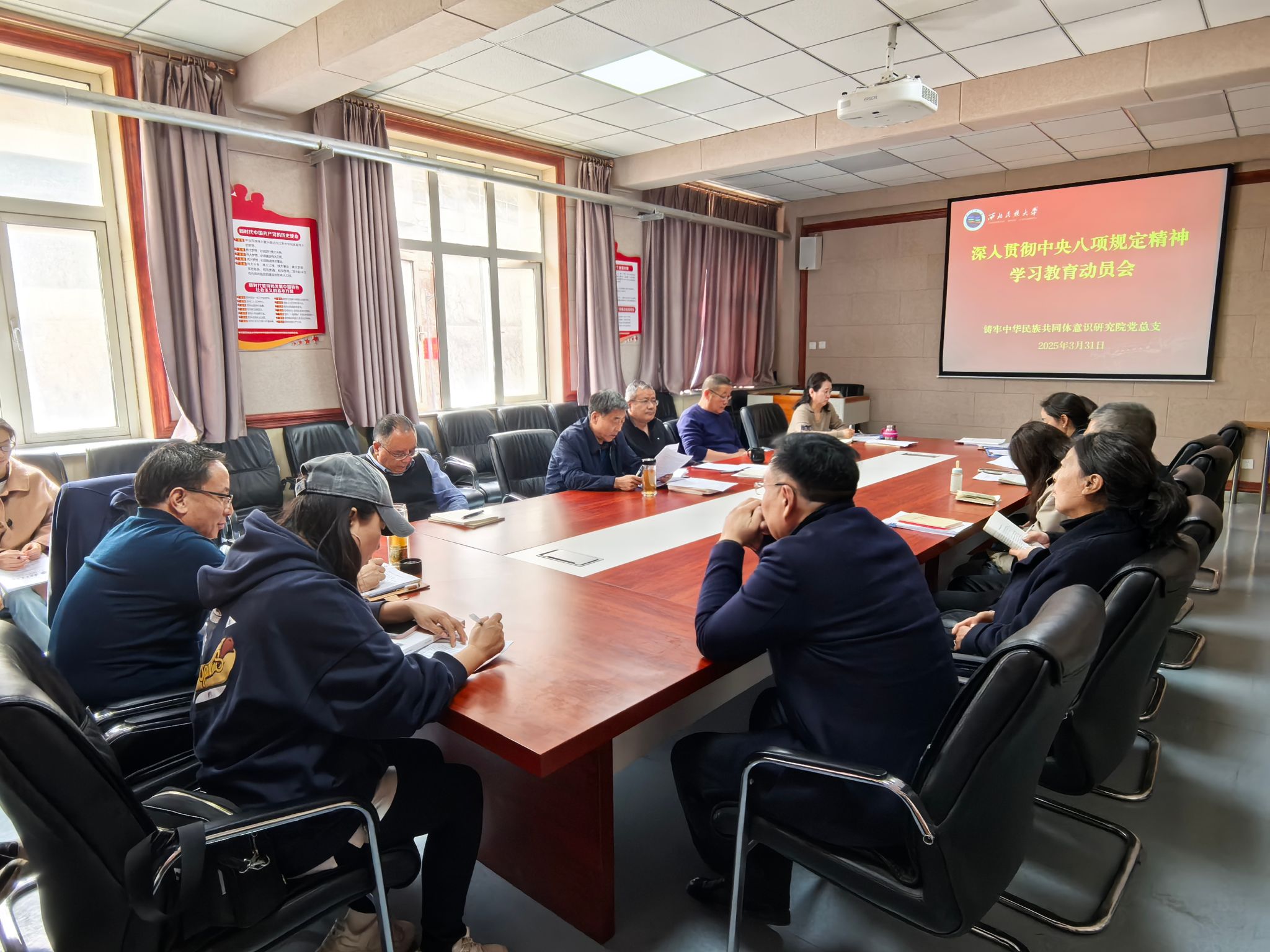 2025 年 3 月 31 日,鑄牢中華民族共同體意識研究院黨總支組織召開了深入貫徹中央八項規定精神學習教育動員部署會。會議由黨總支書記王志軍主持,研究院黨總支委員、全體黨員參加。