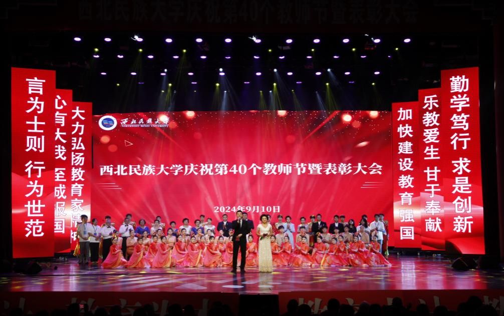 大會對獲得各類獎勵和榮譽稱號的教職工先進集體和個人進行了表彰,為從教30年教師、榮休教師頒發紀念章和證書,為新聘任班導師頒發聘書,組織新入職教師宣誓。西北民族大學附屬小學、離退休教師合唱團、音樂學院、舞蹈學院等單位師生表演了精彩節目。
