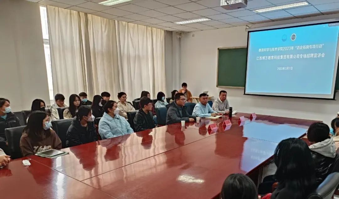 2023年3月7日上午,教育科學與技術學院邀請江西博方教育科技集團有限公司舉辦了現場招聘宣講會。該公司負責人、學院領導、部分2023屆畢業生參加了宣講會。