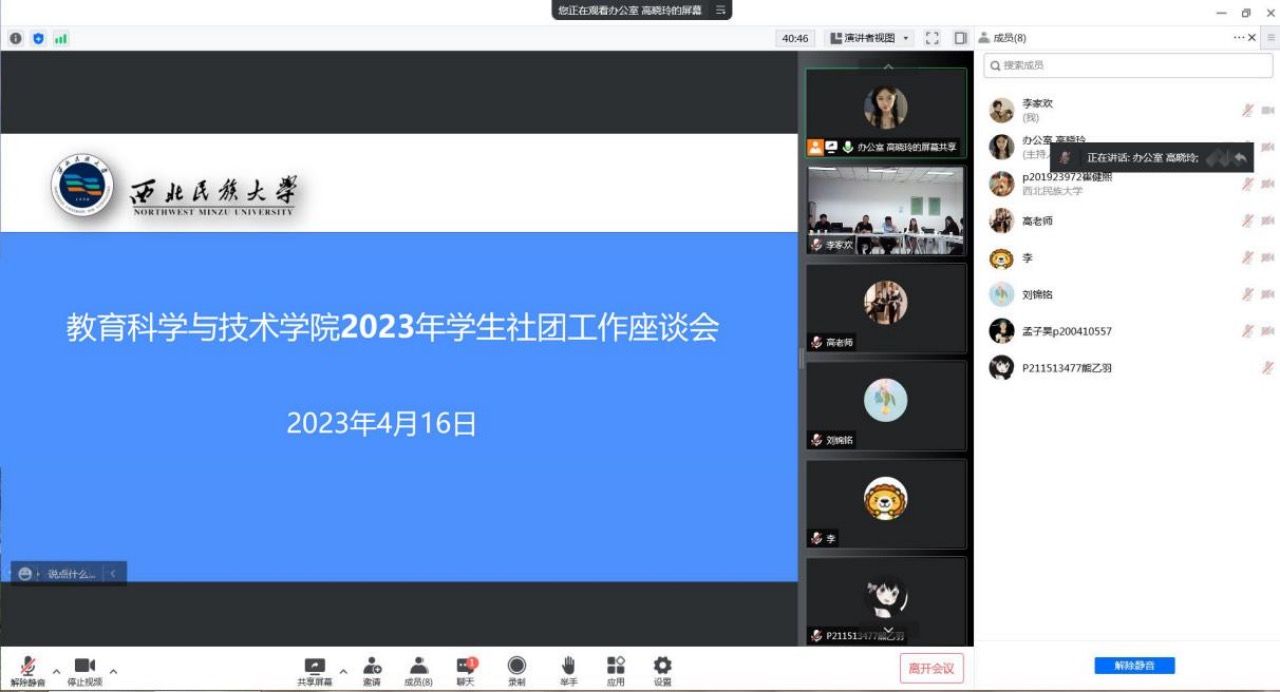 2023年4月16日,教育科學與技術學院以線上線下結合的方式召開2023年學生社團工作座談會。學院黨委書記久美道杰,社團指導教師郭治虎、李文麗及掛靠社團骨干學生,學院團委、學生會負責同學參加會議。學院政治輔導員高潔主持會議。