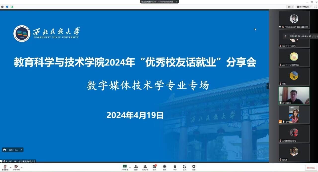 2024年4月19日晚,教育科學與技術學院線上舉辦了2024年第三場“優秀校友話就業”分享會—數字媒體技術專業專場。學院教師,部分畢業生,以及數字媒體技術專業全體本科生參加。分享會由數字媒體技術系主任田雯雯老師主持。