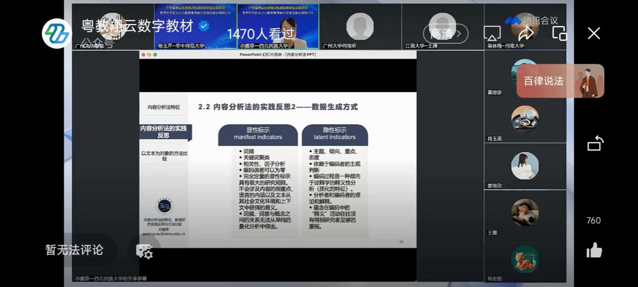 我院尕藏草教授做了“內容分析法的特征、教育研究實踐反思與方法比較”的主題講座,以跨學科的視角探析了內容分析法以文本為研究對象的特征、應用模式以及規范化問題等。在研討環節與各位專家就內容分析法在智能時代的應用、內容分析法與其他研究方法的比較等話題展開了深入討論。