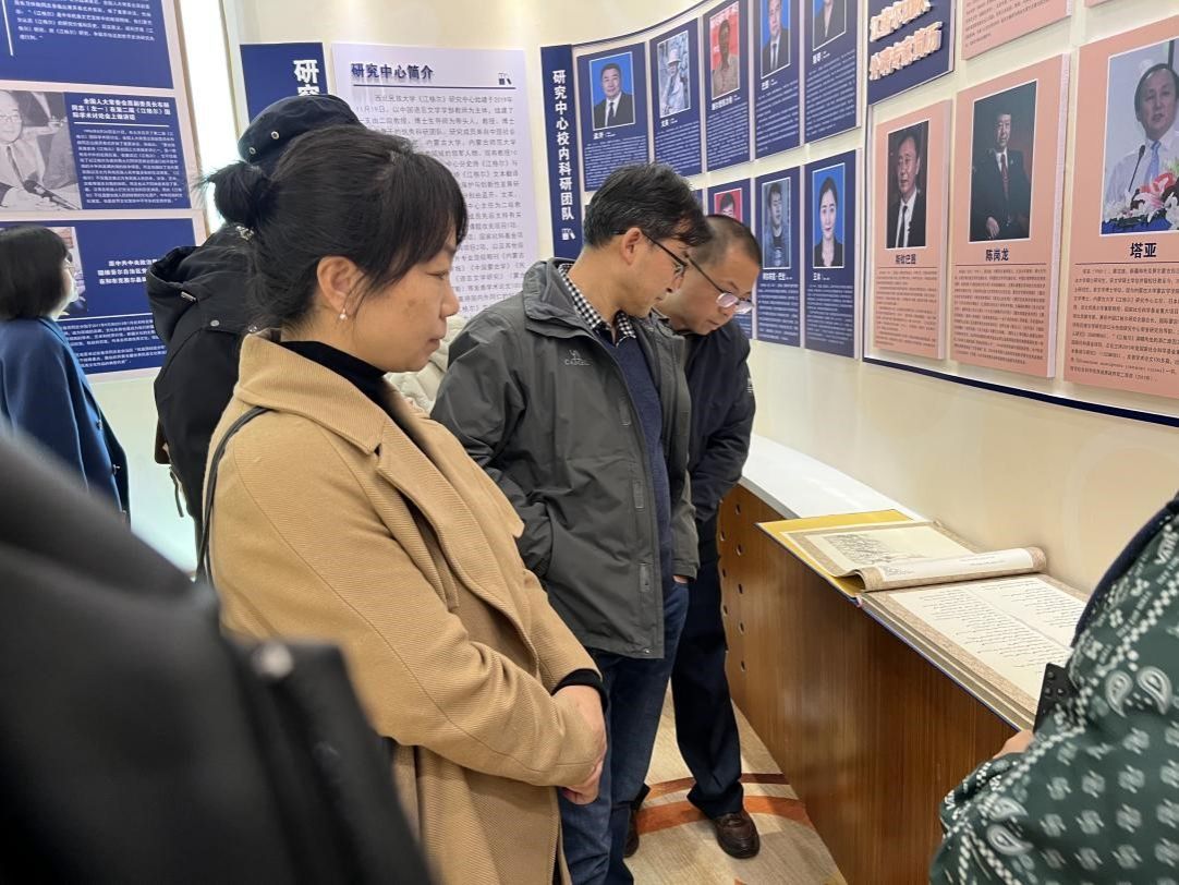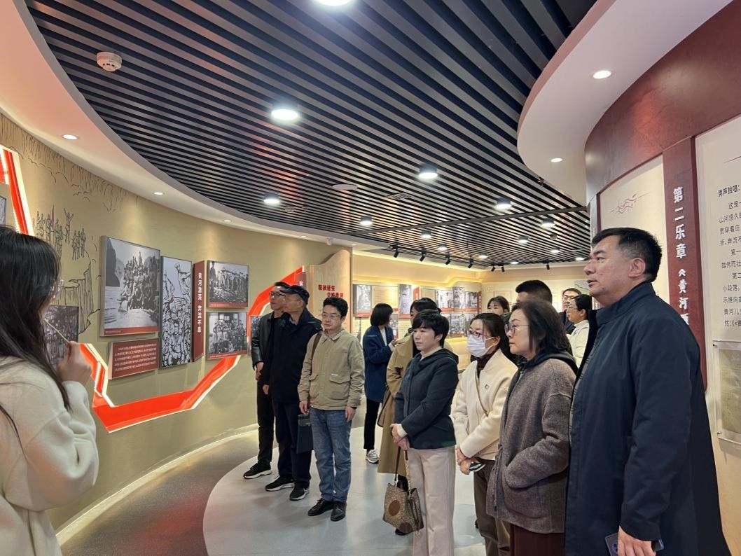 參觀中,展廳內(nèi)豐富的展品、詳實的記載、生動的影像資料仿佛都在訴說那段波瀾壯闊的歲月,學院教師跟隨講解員仔細聆聽了《黃河大合唱》歌曲的創(chuàng)作歷程、背后感人肺腑的紅色故事以及中國“三大史詩”研究歷史、學術(shù)積淀及國際影響等,不時駐足凝視,感受震撼人心的藝術(shù)魅力。