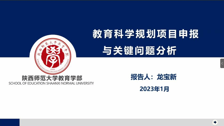 2023年1月13日晚,陜西師范大學龍寶新教授應邀為我院師生作了題為《教育科學規劃項目申報與關鍵問題分析》的線上講座。講座由學院院長沙景榮教授主持。學院全體教師、碩士生和部分本科生參加了本次講座。