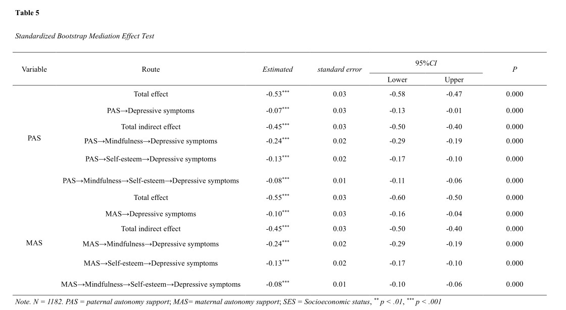 我院師生于2024年5月8日在Frontiers in Psychology期刊發表研究論文“Association Between Parental Autonomy Support and Depressive Symptoms among Chinese College Students: The Chain-mediating Effects of Mindfulness and Self-esteem”。文章主要通過研究父母自主支持與大學生抑郁癥狀之間的關系,以及正念和自尊的作用機制,為預防和干預大學生心理健康問題提供指導意見。研究結果表明父母自主支持和學生抑郁之間存在顯著的負向關聯,而正念和自尊在其中起鏈式中介作用。