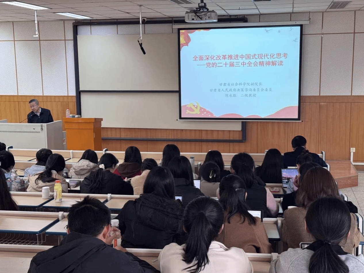 2024年10月25日,學院邀請甘肅省社會科學院副院長、教授陳永勝作《全面深化改革推進中國式現代化思考——黨的二十屆三中全會精神解讀》專題講座,陳教授從深入把握全面深化改革的歷史任務、深刻認識全面深化改革對中國式現代化的深遠影響、牢牢把握全面深化改革推進中國式現代化的關鍵點、全方位把握全面深化改革面臨的諸多挑戰、進一步全面深化改革推進中國式現代化五個方面全面解讀黨的二十屆三中全會精神。
