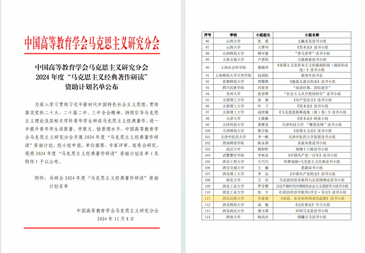 近日,中國高等教育學會馬克思主義研究分會2024年度“馬克思主義經典著作研讀”資助計劃名單正式公布。經學院組織、個人申報、組委會評審,我院研究生李素萌的《家庭、私有制和國家的起源》(指導教師楊建毅教授)讀書小組成功入選資助計劃。此次為馬克思主義學院學生第二次入選該項資助計劃,這是學院始終秉持“勵學修身,求真圖強”的院訓、高度重視提升學生“讀原著、學原文、悟原理”理論水平和專業素養的重要縮影。