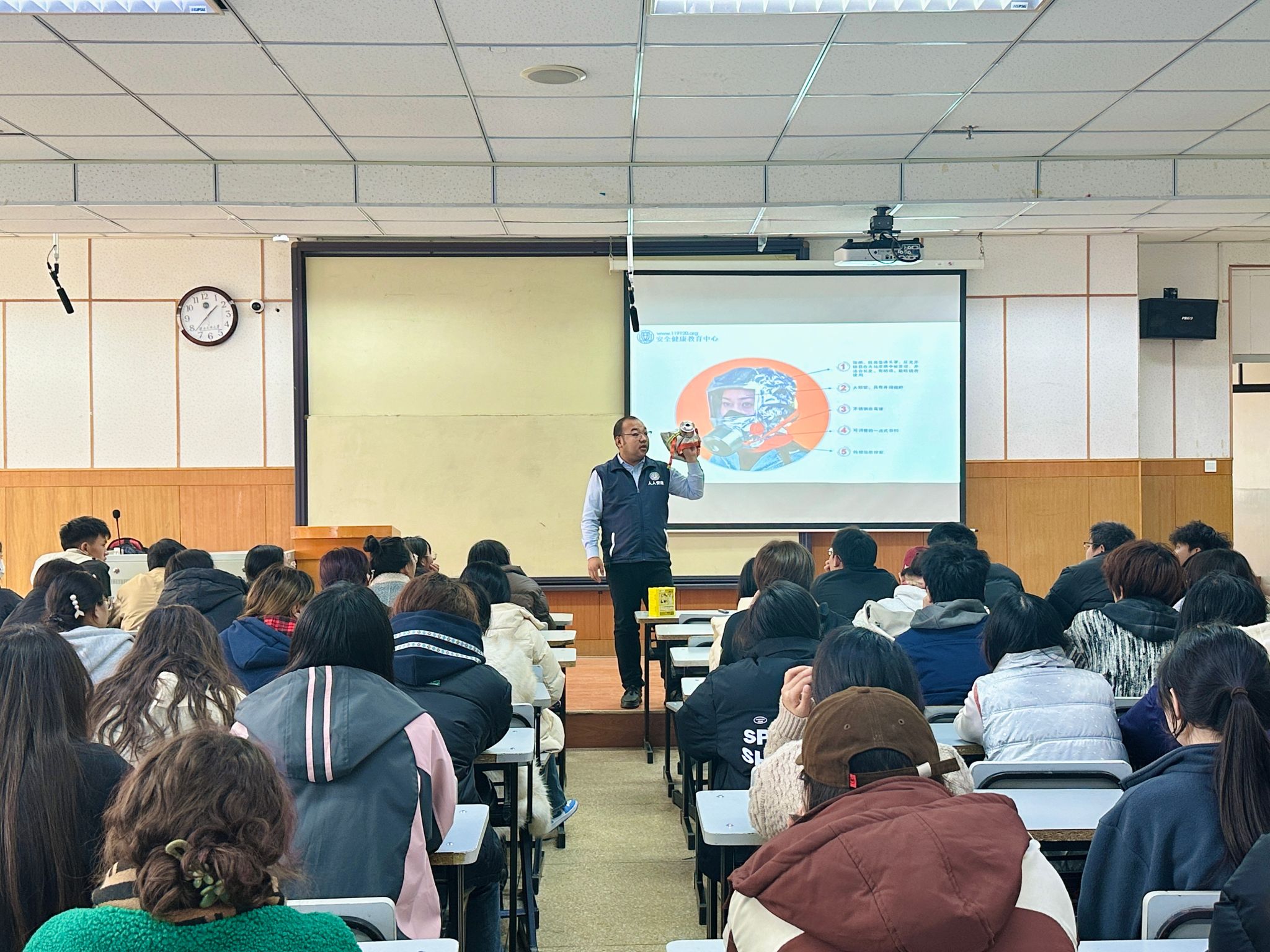 落實消防責任,防范安全風險。王安宇根據近年來全國各地發生火災的數據和一系列觸目驚心的視頻案例,使同學們深刻意識到消防隱患所潛藏的巨大安全風險。他結合校園生活實際,著重指出火災的突發性特征,強調務必養成“人走斷電”的良好習慣。同時通過提問互動的方式仔細講解了遭遇火災時行之有效的逃生技巧,以及常用滅火設備和防護面具的使用方法,以提高學生在火災發生時的應變能力和逃生能力。