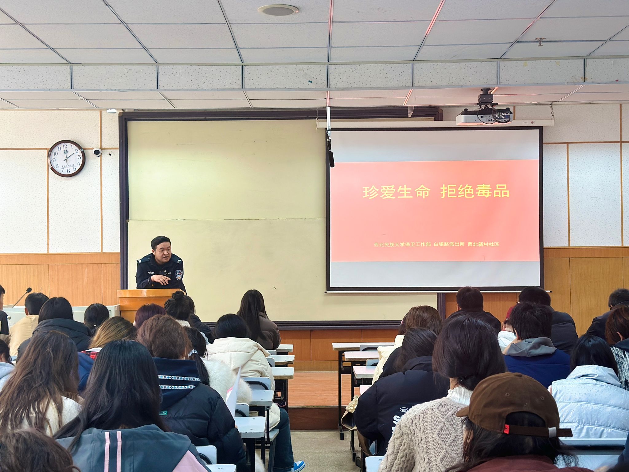 時刻繃緊防范之弦,謹防新型電信詐騙。線旭磊憑借其多年的辦案經驗以及大量詳實的案例講解,對電信詐騙的常見手段進行深入剖析。他鄭重告誡同學們在網絡社交、購物消費等日常活動中,要以高度謹慎的態度保護好個人信息,切不可因一時疏忽而讓不法分子有機可乘。最后,他講解了新型毒品對社會的極大危害性和傳播渠道,教育同學們要遠離毒品。西北新村社區工作人員隨后發放了禁毒宣傳冊。