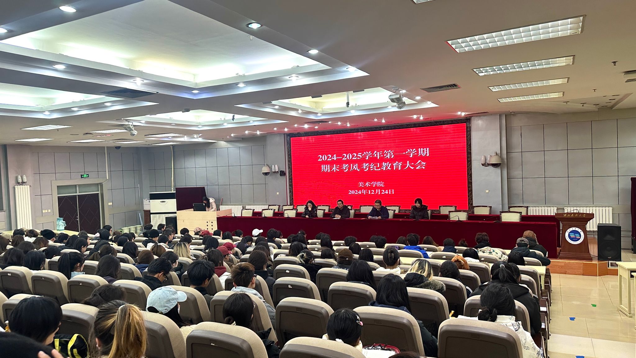 為嚴肅考風考紀、培育優良學風,美術學院于 2024 年 12 月 24 日在西北新村校區文津樓學術報告廳召開期末考試考風考紀教育大會。學院黨委書記蘇知洋、副院長馮炳超、王茜及全體學生參加,會議由團委書記王媛媛主持。