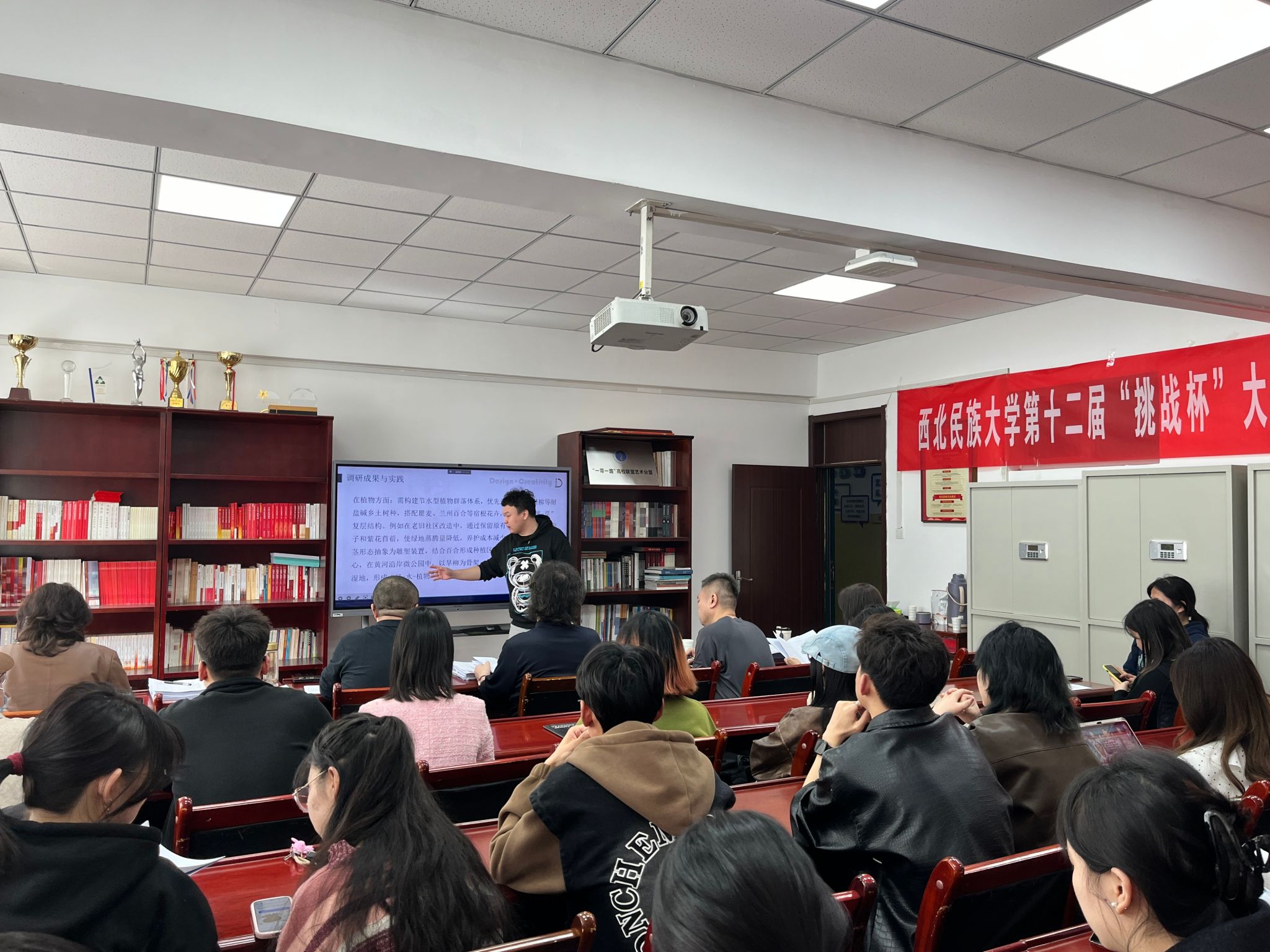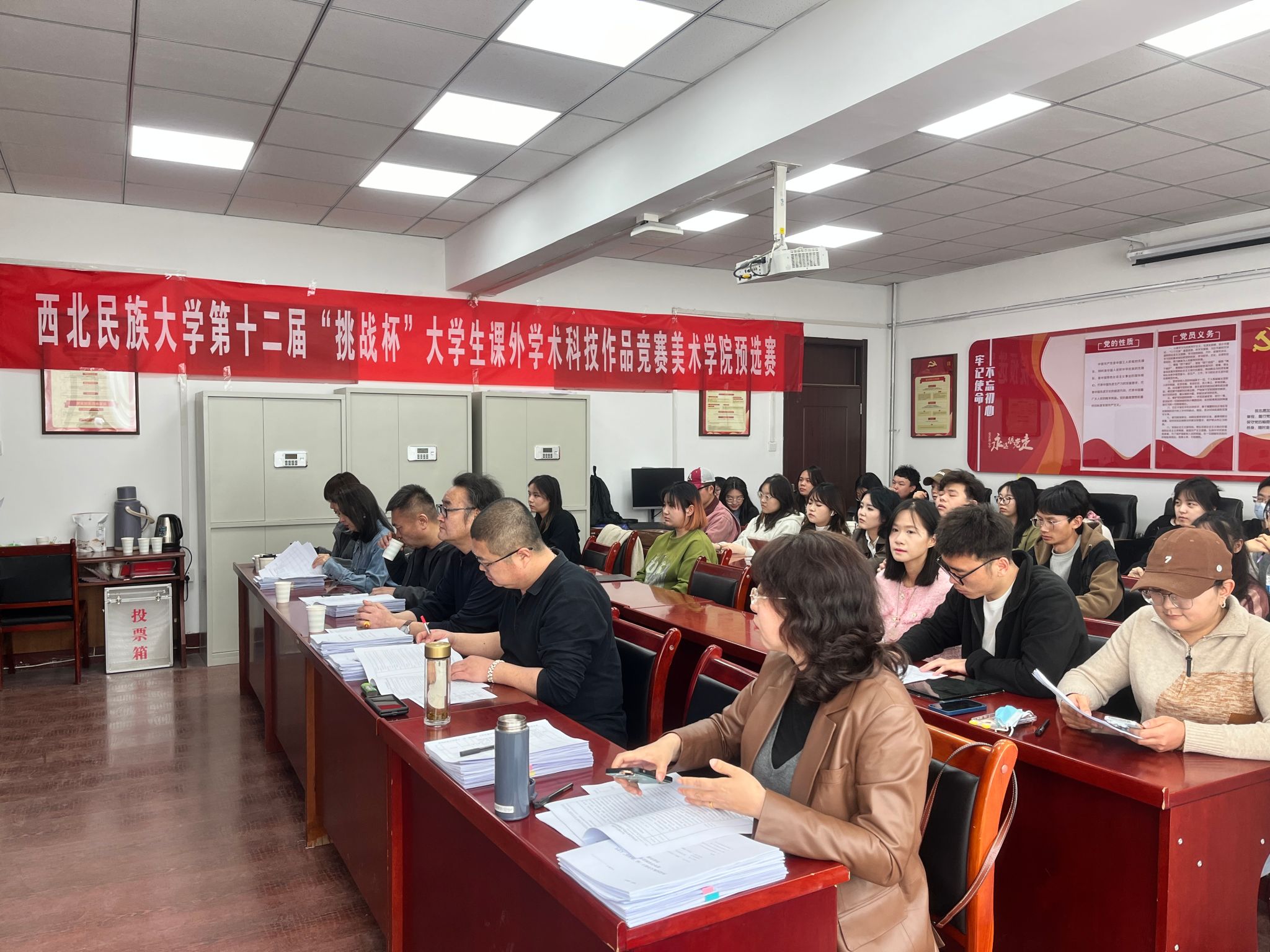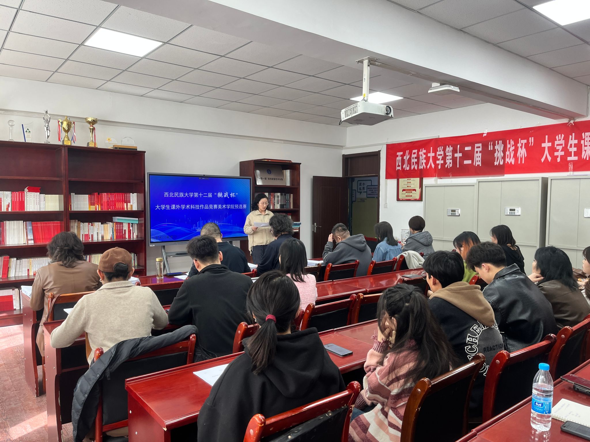 為進(jìn)一步培養(yǎng)大學(xué)生的創(chuàng)新精神和實(shí)踐能力,鼓勵(lì)學(xué)生積極參與科研訓(xùn)練,3月26日下午,西北民族大學(xué)第十二屆“挑戰(zhàn)杯”大學(xué)生課外學(xué)術(shù)作品競(jìng)賽美術(shù)學(xué)院預(yù)選賽在美術(shù)樓209會(huì)議室順利舉辦。本屆大賽自1月啟動(dòng)以來,在學(xué)院團(tuán)委的大力宣傳動(dòng)員下,共吸引23支隊(duì)伍參賽,報(bào)名人數(shù)再創(chuàng)新高,其中包括12個(gè)本科生項(xiàng)目,11個(gè)碩士研究生項(xiàng)目,作品內(nèi)容涵蓋了哲學(xué)社會(huì)科學(xué)類社會(huì)調(diào)查報(bào)告、學(xué)術(shù)論文和科技發(fā)明制作三大類。預(yù)選賽由學(xué)院團(tuán)委書記王媛媛主持,副院長(zhǎng)馮炳超、王茜,以及各基層教學(xué)組織負(fù)責(zé)人擔(dān)任比賽評(píng)委。