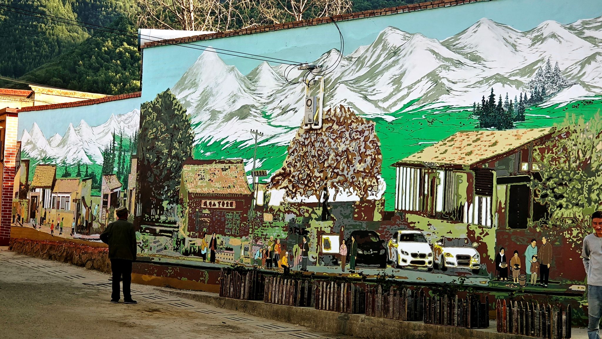 6月初,施工全面鋪開。師生們頂著烈日、踏著晨露,以丙烯為墨、以墻面為紙,將灰白的鄉村墻壁轉化為流淌的藝術長廊:《屋頂交響》——層疊單坡屋頂躍然墻面,再現農耕文明智慧;《守望》——鄰里互助、孝老愛親場景,彰顯淳樸鄉風;《麥浪山花》——本土生態意象鋪陳宜居詩畫。墻繪甫一亮相,即吸引村民駐足欣賞、拍照留念,被譽為“家門口的露天美術館”。