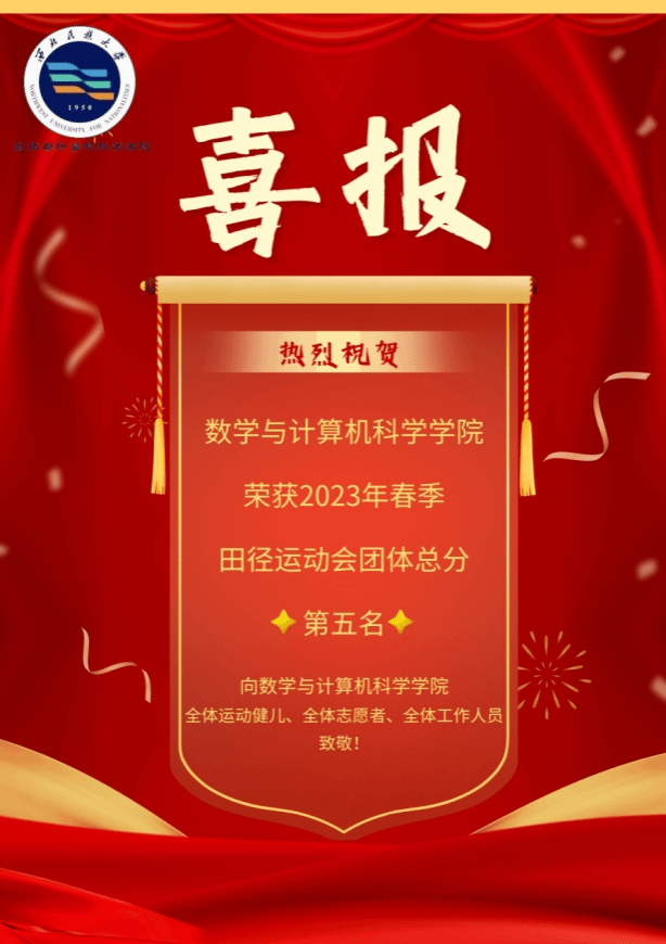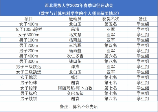 2023年5月12日—14日,西北民族大學(xué)2023年春季田徑運(yùn)動會暨第一屆民族傳統(tǒng)運(yùn)動會在榆中校區(qū)民康體育場和民美體育場舉行。數(shù)學(xué)與計(jì)算機(jī)科學(xué)學(xué)院積極響應(yīng)學(xué)校號召,比賽前充分準(zhǔn)備、比賽中奮勇拼搏,最終獲得了團(tuán)體第五名的好成績。