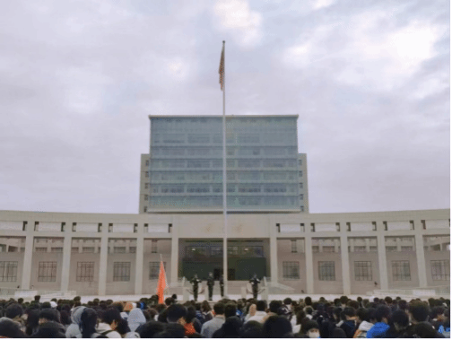 7時55分,升旗儀式正式開始,國旗護衛隊的同學們踏著鏗鏘有力的步伐,從圖書館大門前出發,護送著五星紅旗正步走向旗桿,全體師生面向國旗莊嚴肅立;8時整,雄壯激昂的《義勇軍進行曲》奏響,師生們齊唱國歌,并注視著鮮紅的五星紅旗冉冉升起,在耀眼的晨光中迎風飄揚。