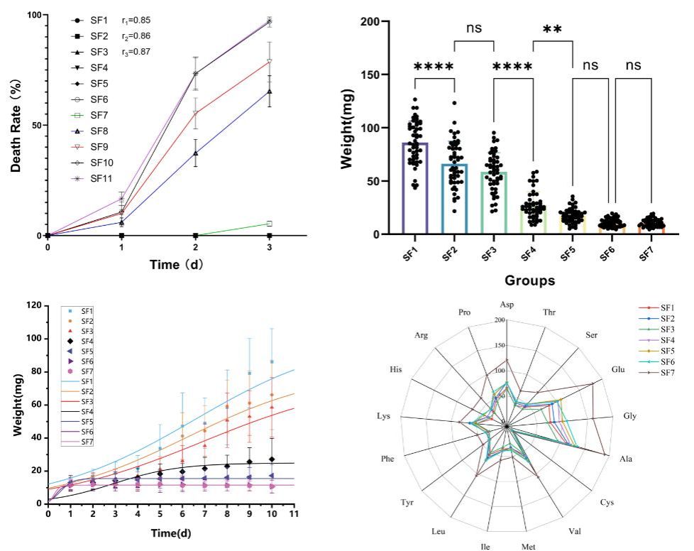 生物醫(yī)學(xué)研究中心生物制藥與材料工程創(chuàng)新團(tuán)隊(duì)使用10%血液增量梯度(0–100%)飼喂亮斑扁角水虻(Black soldier fly,BSFL)幼蟲,研究了牛血比例與BSFL體重增加、死亡率、營(yíng)養(yǎng)組成、脂肪酸含量和氨基酸含量之間的相關(guān)性。結(jié)果表明,牛血含量與BSFL死亡率之間呈正相關(guān),血液比例低于60%時(shí),存活率超過95%。隨著牛血含量的增加,幼蟲體重呈負(fù)相關(guān)。營(yíng)養(yǎng)分析顯示,BSFL中的粗蛋白質(zhì)含量隨著牛血比例增加而成比例增加(14.75–25.45 g/100 g),而粗脂肪含量相應(yīng)減少(10.70–4.66 g/100 g)。糖含量在各組中保持相對(duì)恒定。脂肪酸分析顯示,隨著牛血含量的增加,棕櫚油酸和肉豆蔻酸的水平增加,而油酸、亞油酸和亞麻酸的水平減少。氨基酸含量除20%屠宰血液組外,均隨著血液比例的增加而增加。本研究強(qiáng)調(diào)了BSFL對(duì)牛血的生物轉(zhuǎn)化潛力,并強(qiáng)調(diào)了飼料中蛋白質(zhì)、脂肪和糖濃度對(duì)BSFL生長(zhǎng)的影響。這些研究結(jié)果為合理利用屠宰場(chǎng)血液廢棄物提供了有價(jià)值的見解,有助于開發(fā)更可持續(xù)的廢物管理和動(dòng)物飼料生產(chǎn)方法。