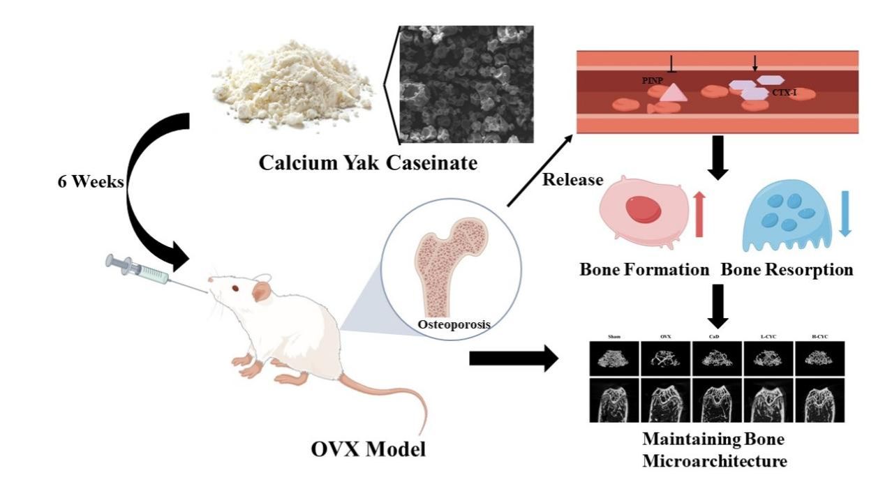 PMOP作為中老年女性群體高發(fā)的代謝性骨病,其有效防控已成為公共衛(wèi)生領(lǐng)域的重要議題。本研究通過(guò)建立去卵巢(Ovariectomized, OVX)小鼠模型,系統(tǒng)評(píng)估牦牛酪蛋白酸鈣(Yak casein calcium, CYC)作為新型營(yíng)養(yǎng)補(bǔ)充劑對(duì)PMOP的干預(yù)效應(yīng)。研究發(fā)現(xiàn),補(bǔ)充CYC后OVX小鼠的血清鈣水平明顯下降,血清磷水平升高。此外,血清堿性磷酸酶(ALP)和Ⅰ型膠原羧基端肽(CTX-I)顯著降低,Ⅰ型原膠原N端前肽(PINP)顯著升高。以上結(jié)果表明CYC在調(diào)節(jié)骨形成和骨吸收之間的平衡、增加骨形成,減少骨吸收方面具有潛在意義。除此之外,補(bǔ)充CYC增加了骨小梁面積分?jǐn)?shù)、骨骼肌面積分?jǐn)?shù)、骨密度(BMD)、骨組織體積分?jǐn)?shù)(BV/TV)和骨小梁數(shù)量(Tb.N),降低了骨骼肌纖維間距、骨小梁分離度(Tb.Sp)、骨小梁模式因子(Tb.Pf)和骨小梁結(jié)構(gòu)模型指數(shù)(SMI)。研究顯示出與傳統(tǒng)鈣制劑相當(dāng)?shù)墓趋辣Wo(hù)效應(yīng),并表現(xiàn)出潛在的優(yōu)勢(shì)。研究結(jié)果不僅為開(kāi)發(fā)新型鈣營(yíng)養(yǎng)補(bǔ)充劑提供理論依據(jù),更為高原特色生物資源在功能性食品領(lǐng)域的應(yīng)用開(kāi)辟了新方向。