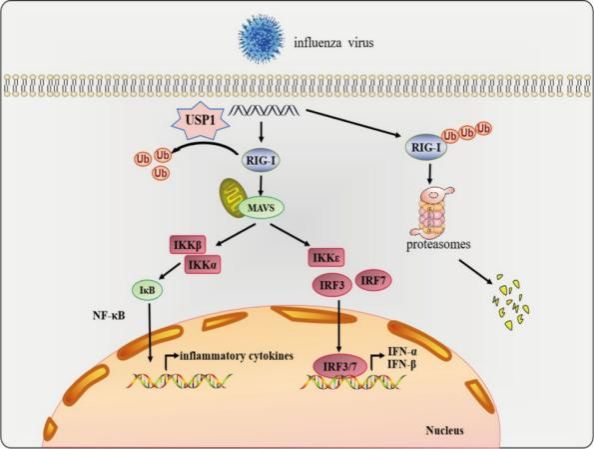 研究發(fā)現(xiàn),USP1通過介導RIG-I的去泛素化,增強其蛋白穩(wěn)定性,從而激活下游的NF-κB信號通路,促進I型干擾素(IFN-I)和促炎細胞因子的產(chǎn)生,最終抑制流感病毒的復制。這些結(jié)果不僅揭示了USP1通過RIG-I介導的抗病毒免疫新機制,還為利用基因編輯技術(shù)構(gòu)建高產(chǎn)流感疫苗的MDCK細胞株提供了潛在靶點。研究證明了USP1在宿主抗病毒免疫中的關(guān)鍵作用,為新型流感疫苗開發(fā)策略奠定了理論基礎。