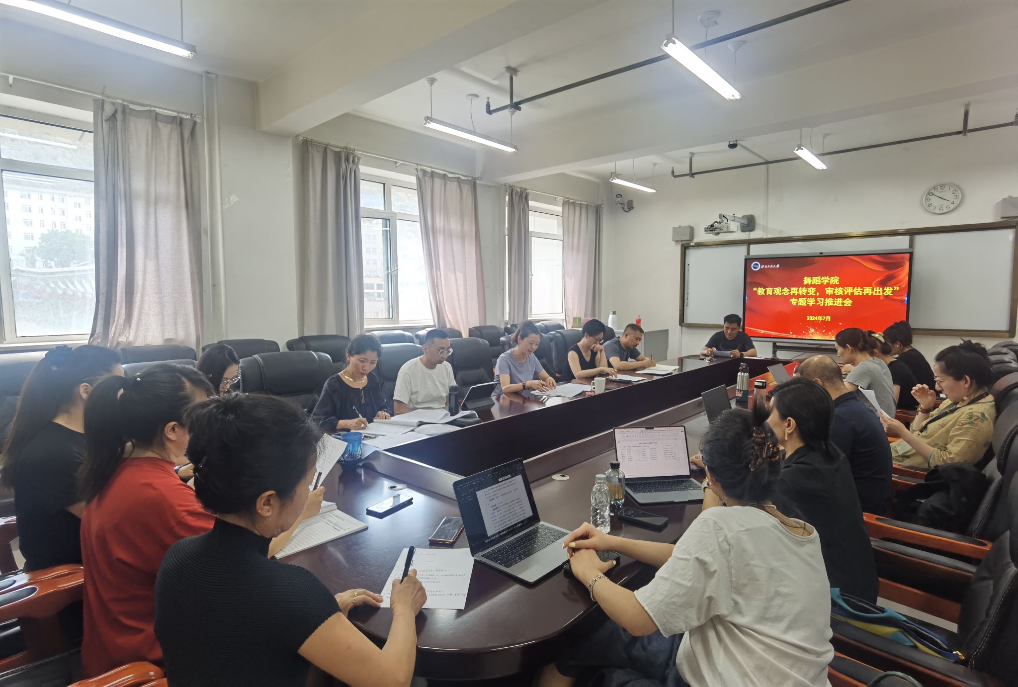 根據學校和學院本科教育教學審核評估診斷性評估整改工作進度安排,7月17日,舞蹈學院召開“教育觀念再轉變,審核評估再出發”專題學習推進會,學院領導班子成員、各基層教學組織負責人、各課程組組長等近二十人參加會議。會議由教學管理辦公室主任卓瑪吉主持。