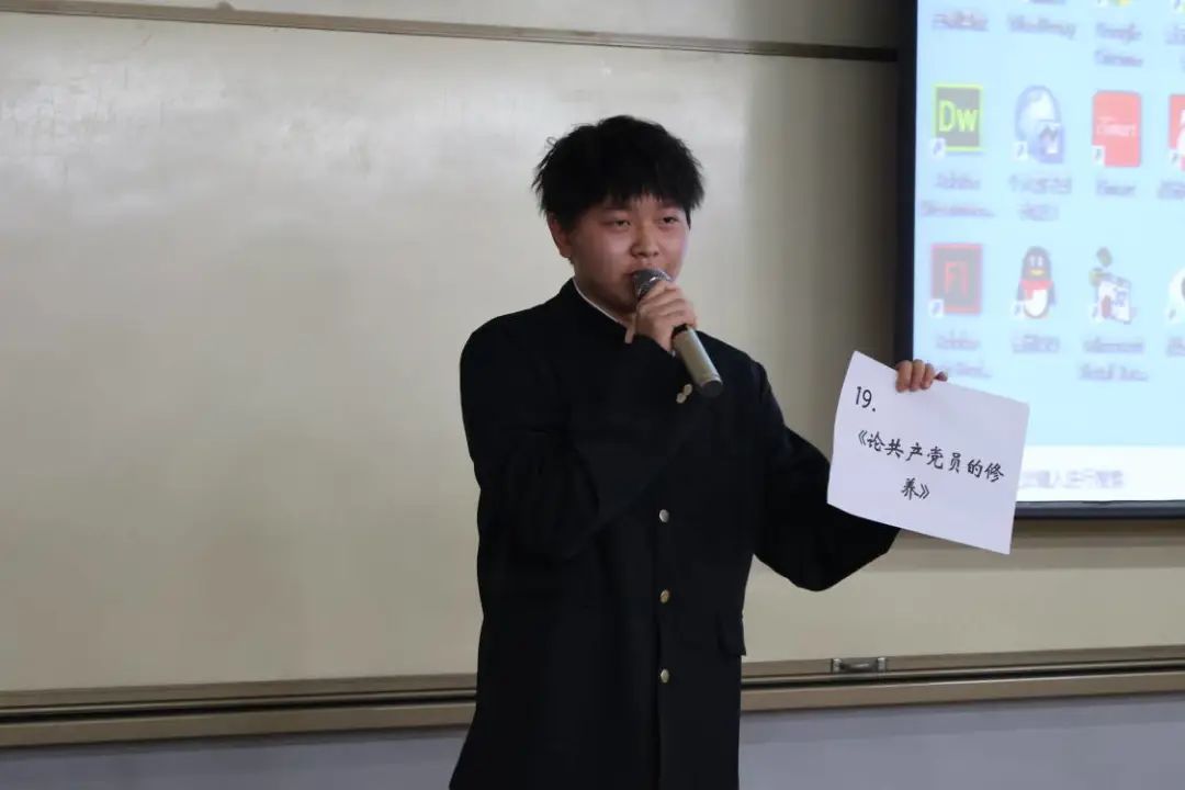 參賽選手以真摯的情感、鮮活的史料,富有感染力的語言展現了新時代青年對延安精神的信仰與傳承。來自新聞傳播學院的文悅同學用飽含深情的語言詮釋了在延安精神感召下“清澈的愛只為中國”,來自新聞傳播學院的唐士欽同學重溫了《論共產黨員的修養》,來自化工學院的者鳳趙同學用“時光機”穿梭回延安的崢嶸歲月,并自制鐮刀錘頭交于頭頂,表達愛黨之情,來自新聞傳播學院的霍懷禮同學將延安故事寫成詩,用吉他彈唱延安的旋律。