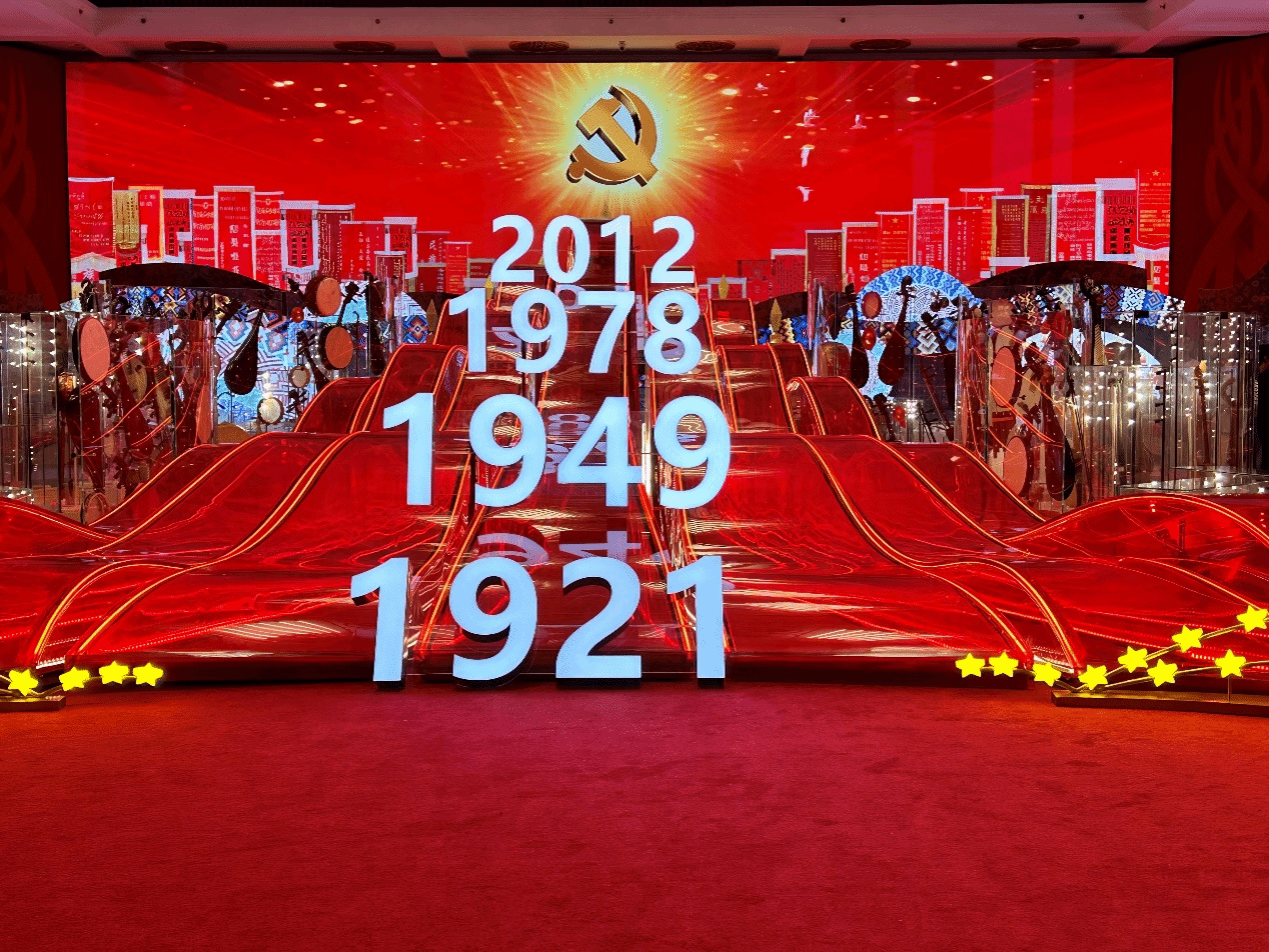 在“大團結”單元,象征“一片紅心心向黨” 的紅旗海浪在展廳翻涌,“1921”“1949”“1978”“2012”四個數字立于其上,分別對應著中國共產黨誕生、中華人民共和國成立、改革開放、十八大召開這四個里程碑式事件。層層推高的波浪代表我們黨在蜿蜒起伏的歷史長河中帶領全國各族人民走向新時代。