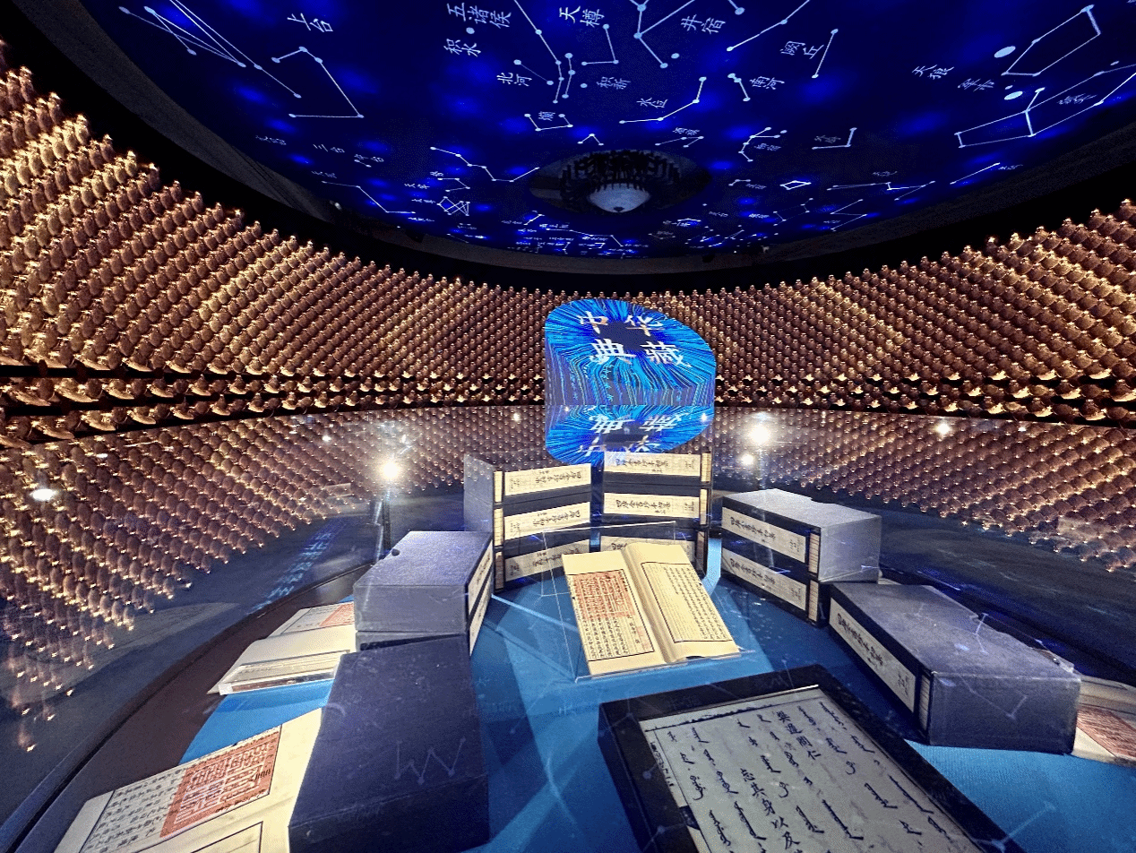 古籍墻以花瓣為設計造型,瓣瓣同心。每一片花瓣中各民族珍貴的典籍文字,流淌到中間的集思柱上,象征著各民族文化在交往交流交融中互學共鑒,構筑了多元一體的中華民族文化。頭頂的星空圖,寓意著千年文脈綿延不斷,中華文化生生不息。
