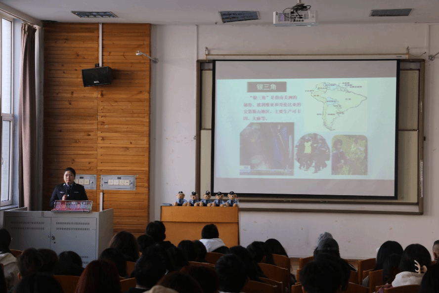 靳亞男警官從毒品的來源、國際禁毒形式、常見毒品種類、毒品的危害等方面講解了毒品預防相關知識,向學生重點介紹了第三代毒品,即“新精神活性物質”。靳亞男警官向學生詳細闡述新型毒品的形態(tài)和危害,使同學們充分認識到生活中潛藏的危險因素,以及吸毒、販毒給身心健康所帶來的嚴重危害,教育引導同學們樹立正確的人生觀、價值觀,提高禁毒意識,遠離毒品危害。