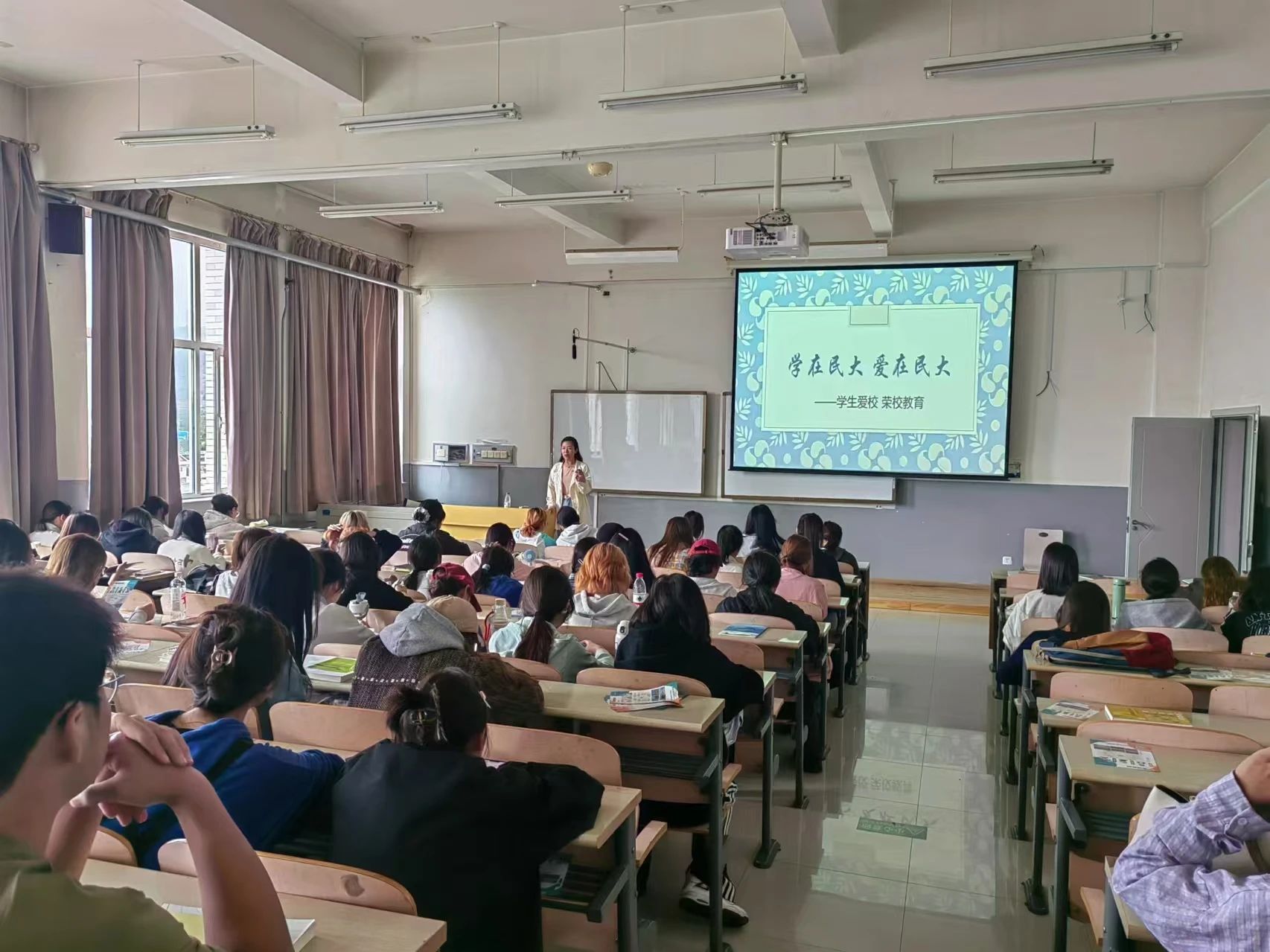 各班組織學(xué)生深入了解學(xué)校的辦學(xué)歷史、理念和校園文化、辦學(xué)成就和社會(huì)聲譽(yù),從而增強(qiáng)大家對(duì)學(xué)校的認(rèn)同感、自豪感和歸屬感。培養(yǎng)青衿之志和責(zé)任擔(dān)當(dāng)通過講述學(xué)校發(fā)展過程中的感人故事和典型事跡,教育引導(dǎo)大家樹立“我與母校共成長(zhǎng)”的主人翁意識(shí)。營(yíng)造和美校園環(huán)境,通過互動(dòng)交流,增進(jìn)彼此友誼,抵制不良風(fēng)氣,有效提高同學(xué)們道德素質(zhì)和文明修養(yǎng),共同營(yíng)造“學(xué)在民大·愛在民大”的和美校園環(huán)境,增進(jìn)了學(xué)生對(duì)校園的認(rèn)同感和歸屬感,增強(qiáng)了學(xué)生知校、愛校、榮校、強(qiáng)校意識(shí),引導(dǎo)學(xué)生將愛國(guó)愛校情感轉(zhuǎn)化為實(shí)際行動(dòng),勤奮學(xué)習(xí),砥礪奮進(jìn)。
