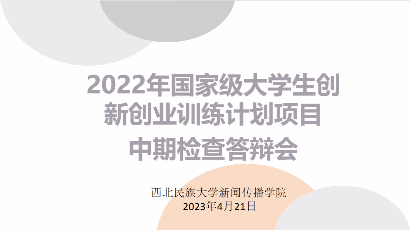 為加強國家級大學生創新創業訓練計劃項目管理,保障項目運行質量,促進國家級大學生創新創業訓練計劃項目良好運行,根據《西北民族大學國家級大學生創新創業訓練計劃項目實施方案》等要求,新聞傳播學院對2022年立項的兩項國家級大學生創新創業訓練計劃項目進行中期檢查工作,并于2023年4月21日召開了新聞傳播學院2022年國家級大學生創新創業訓練項目中期檢查答辯會。會議由新聞傳播學院楊志宏副教授主持。