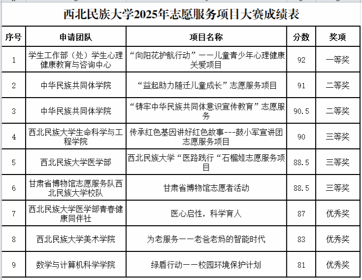 經過緊張激烈的角逐,《向陽花護航行動”——兒童青少年心理健康關愛》項目憑借其投身關愛兒童青少年心理健康的明確目標,以及通過科普宣講等形式將健康知識傳遞給青少年的出色實踐成果,榮獲一等獎。此外,還評選出二等獎兩項,三等獎三項,優秀獎三項。這些獲獎項目各具特色,涵蓋了多個志愿服務領域,充分展示了民大學子在志愿服務方面的多元探索和積極實踐。