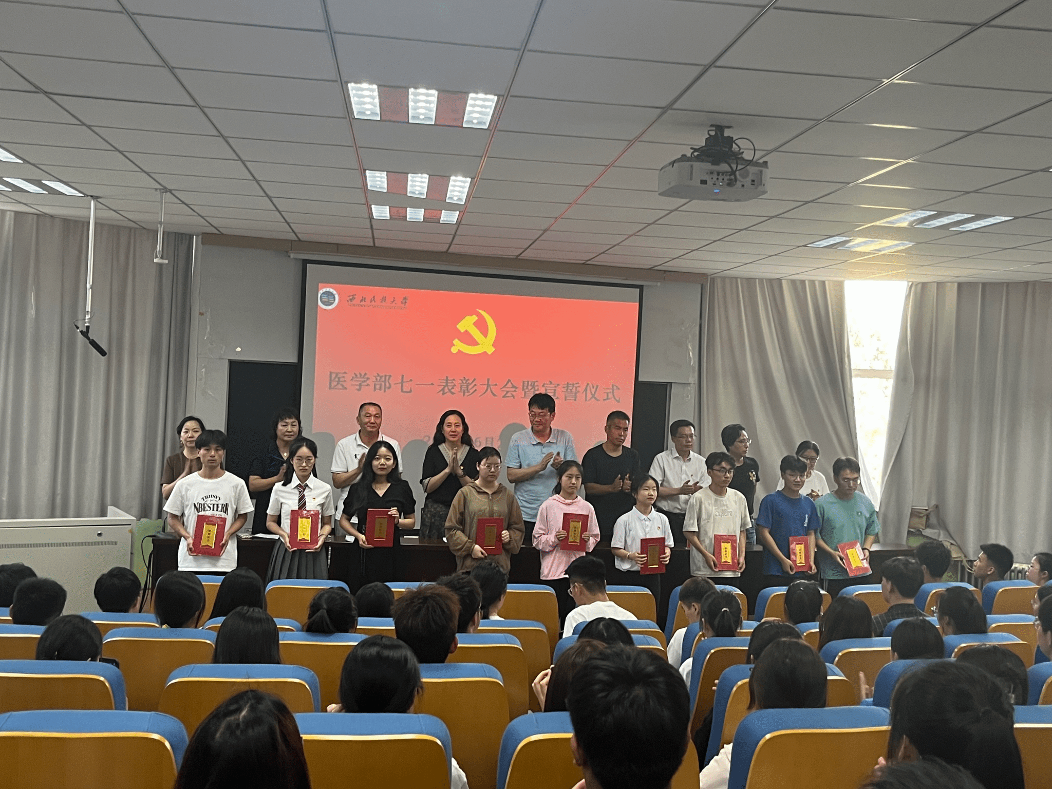今年是中國共產(chǎn)黨成立102周年,為推動學(xué)習(xí)貫徹習(xí)近平新時代中國特色社會主義思想主題教育走深走實(shí)、見行見效,進(jìn)一步激勵廣大黨員奮發(fā)有為,建功立業(yè),醫(yī)學(xué)部在醫(yī)學(xué)樓會議室召開“七一”表彰大會暨入黨宣誓儀式。醫(yī)學(xué)部黨委委員、師生黨員及部分入黨積極分子參會。學(xué)部黨委副書記葉瑜英主持會議。