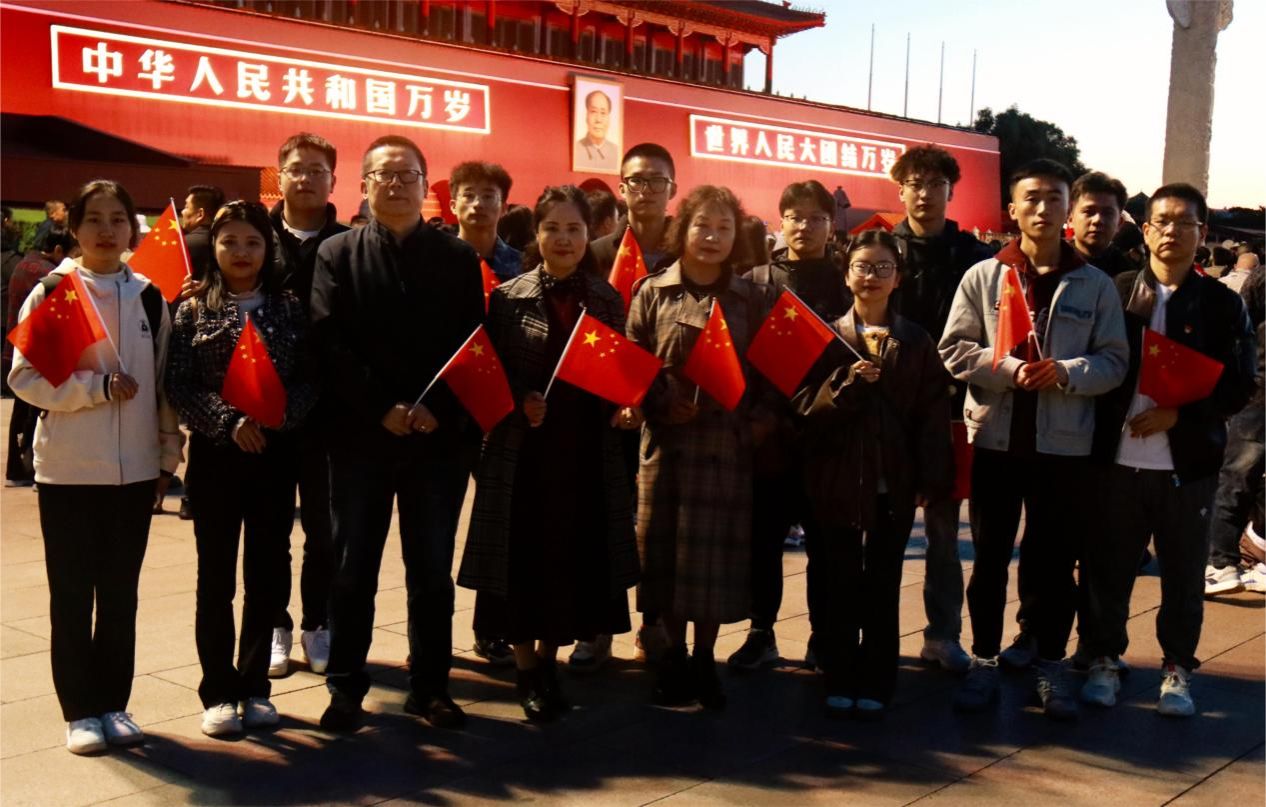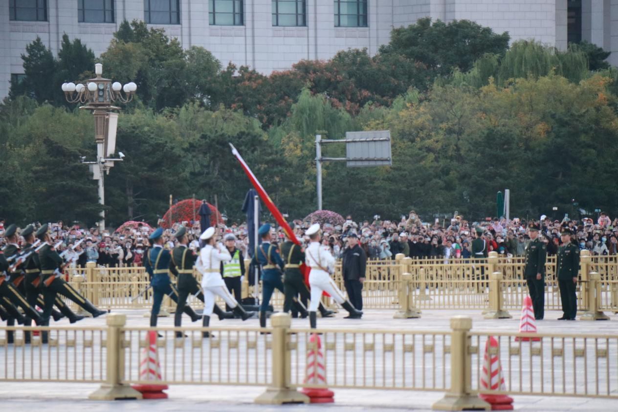 迎著清晨第一縷陽光,民大師生齊聚天安門廣場,六時許,國旗護衛隊在眾人的注視下,邁著整齊劃一的正步走過城樓中央、金水橋,走到國旗桿下,隨著雄壯的《義勇軍進行曲》奏響,全體師生肅然注目,齊唱國歌,五星紅旗在絢麗朝霞的映襯中冉冉升起。此刻,在大家心中升騰的是滾燙的中國心與自豪的民族情。