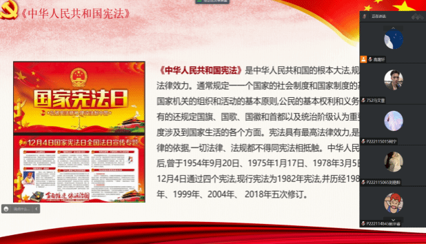 2023年12月1日——7日是我國第六個(gè)憲法宣傳周,12月4日是我國第十個(gè)國家憲法日。今年“憲法宣傳周”的主題是“大力弘揚(yáng)憲法精神 建設(shè)社會(huì)主義法治文化”。為深入開展法治宣傳,提高學(xué)生對(duì)憲法和法治的認(rèn)識(shí),促進(jìn)憲法精神的普及,加強(qiáng)法治文化的建設(shè),醫(yī)學(xué)部組織各班開展了“國家憲法日”系列主題班會(huì)。