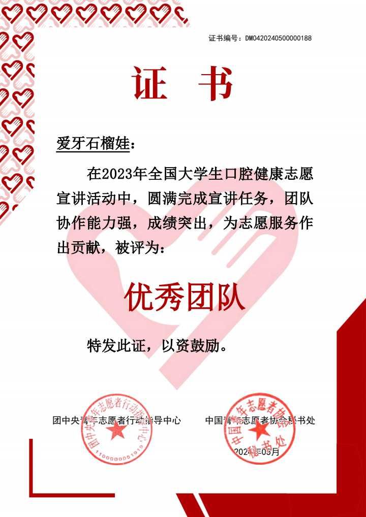 近日,經團中央青年志愿者行動指導中心、中國青年志愿者協會秘書處審核公布,西北民族大學醫學部張軒、吳凌莉老師指導的“愛牙石榴娃”和“牙牙樂聯盟”志愿服務隊,在全國范圍內遴選的1000支大學生口腔健康志愿宣講團隊中脫穎而出,榮獲“優秀團隊”榮譽稱號。