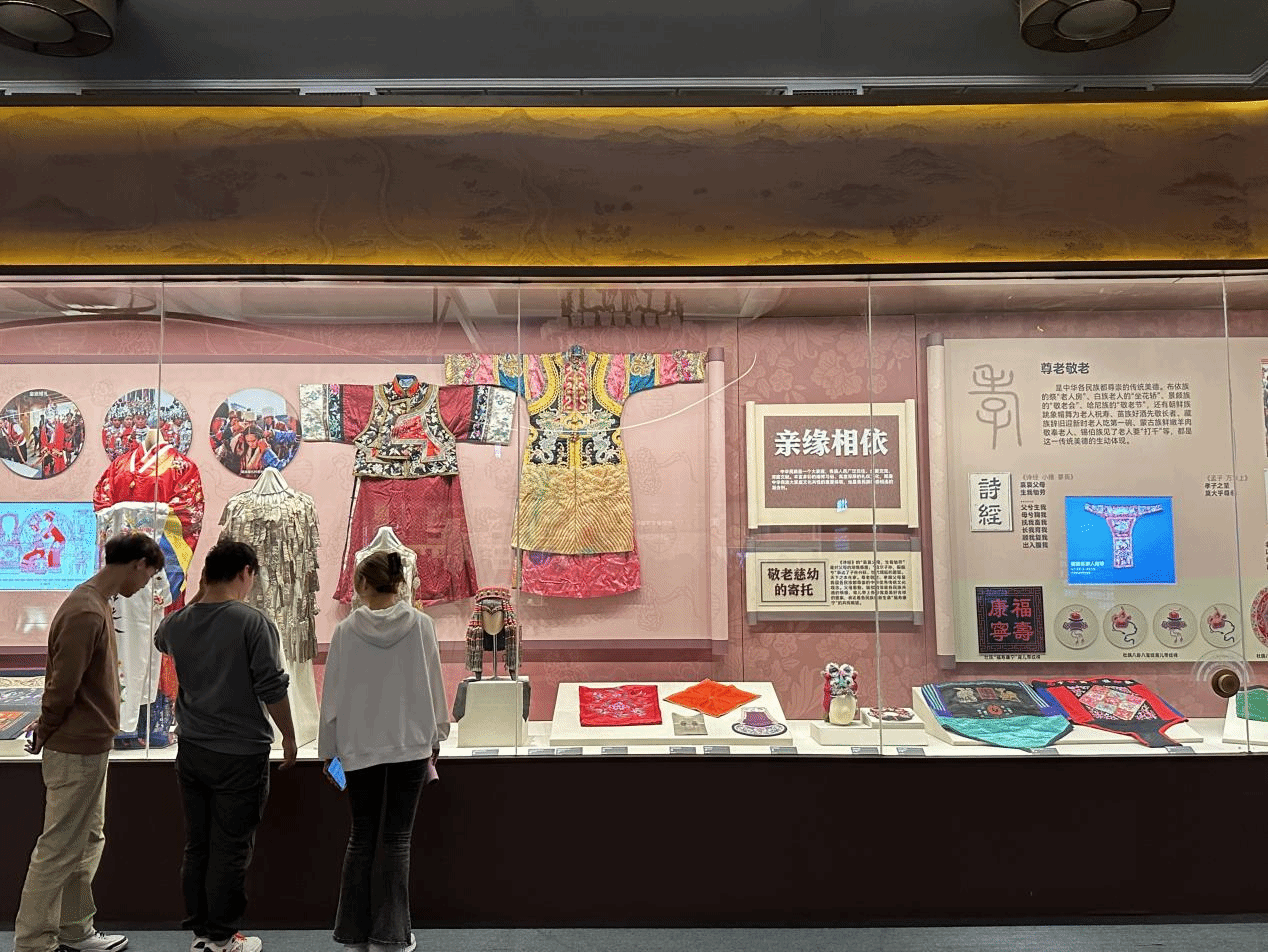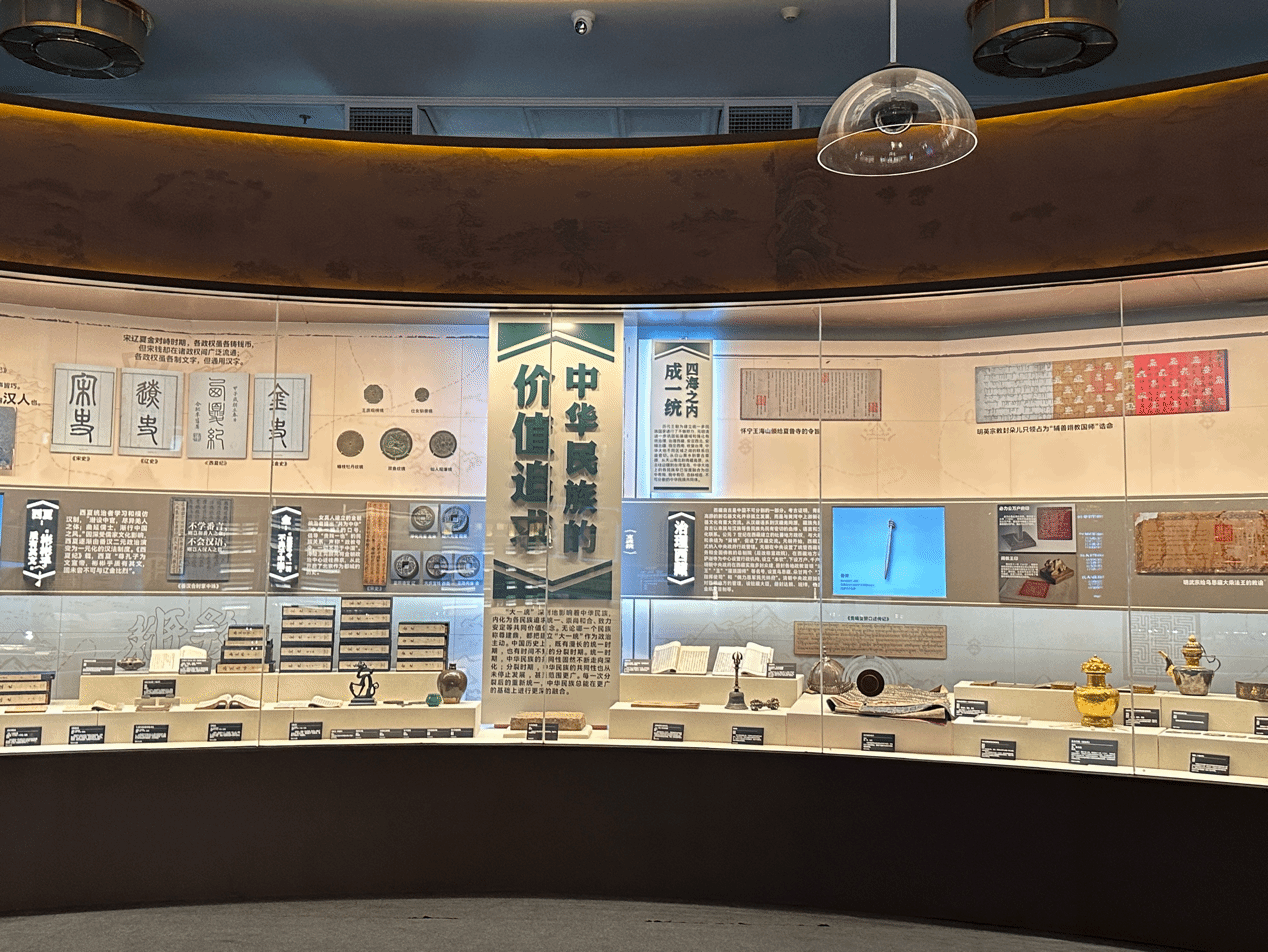 在此展廳,一系列的文物古籍,民族服飾都充分彰顯著中華文化是各民族優(yōu)秀文化的集大成者。在文物古籍上,各民族相互影響、彼此交融,文字互學(xué)、語(yǔ)言相通;在民族服飾上,各民族交織融合、匯聚一堂,藝術(shù)共美、生活互融,在互鑒交融的環(huán)境下共同創(chuàng)造出璀璨輝煌的中華文化。