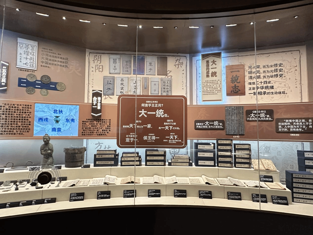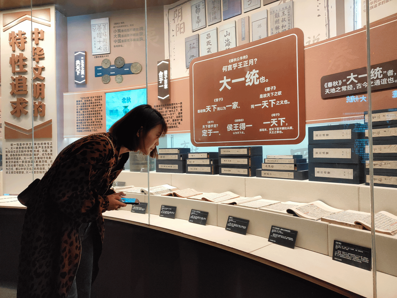 走進(jìn)“大一統(tǒng)”展廳,《春秋公羊傳·隱公元年》中記載的“何言乎王正月?‘大一統(tǒng)’也。”這句話引起了大家的注意,在講解員的介紹下,我們了解到,這是目前可以考證的“大一統(tǒng)”這個(gè)詞最早出現(xiàn)的記載。“大一統(tǒng)”是中國(guó)古代重要的政治理念,也是歷代統(tǒng)治者追求的理想局面。幾千年來(lái),中華民族始終具有“九州共貫、多元一體”的大一統(tǒng)傳統(tǒng),把大一統(tǒng)看作是“天地之常經(jīng),古今之通誼”。中華文明之所以是世界上唯一以國(guó)家形態(tài)發(fā)展至今綿延不斷的偉大文明,一個(gè)重要的原因就是大一統(tǒng)傳統(tǒng)。