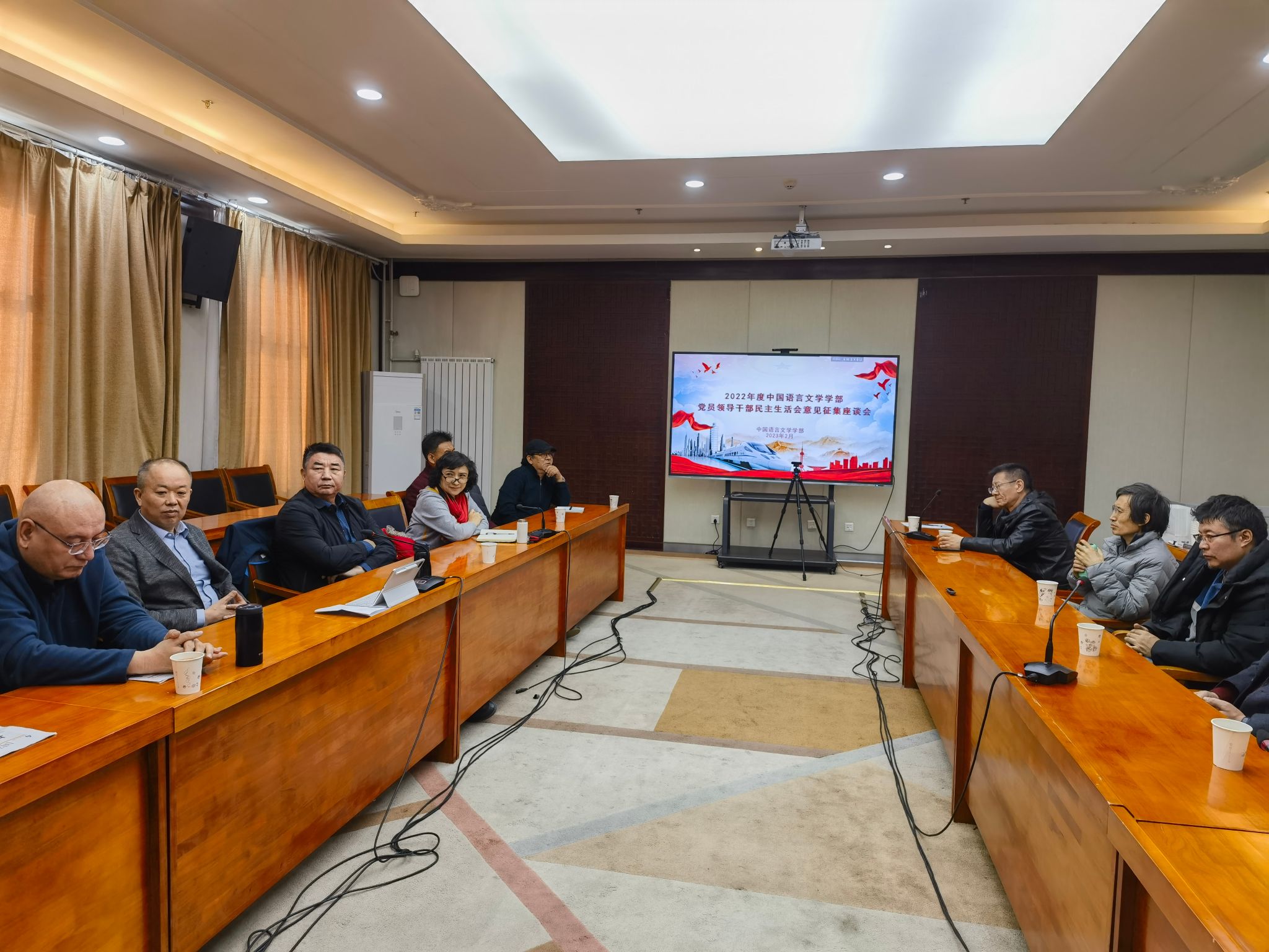 為高質量開好2022年度學部黨員領導干部民主生活會,2023年2月27日上午,中國語言文學學部在校本部禮堂東廳召開2022年度黨員領導干部民主生活會意見征集座談會。學部黨政領導班子、黨員代表、民主黨派及無黨派代表等參加了座談會。會議由學部黨委書記丁勝主持。