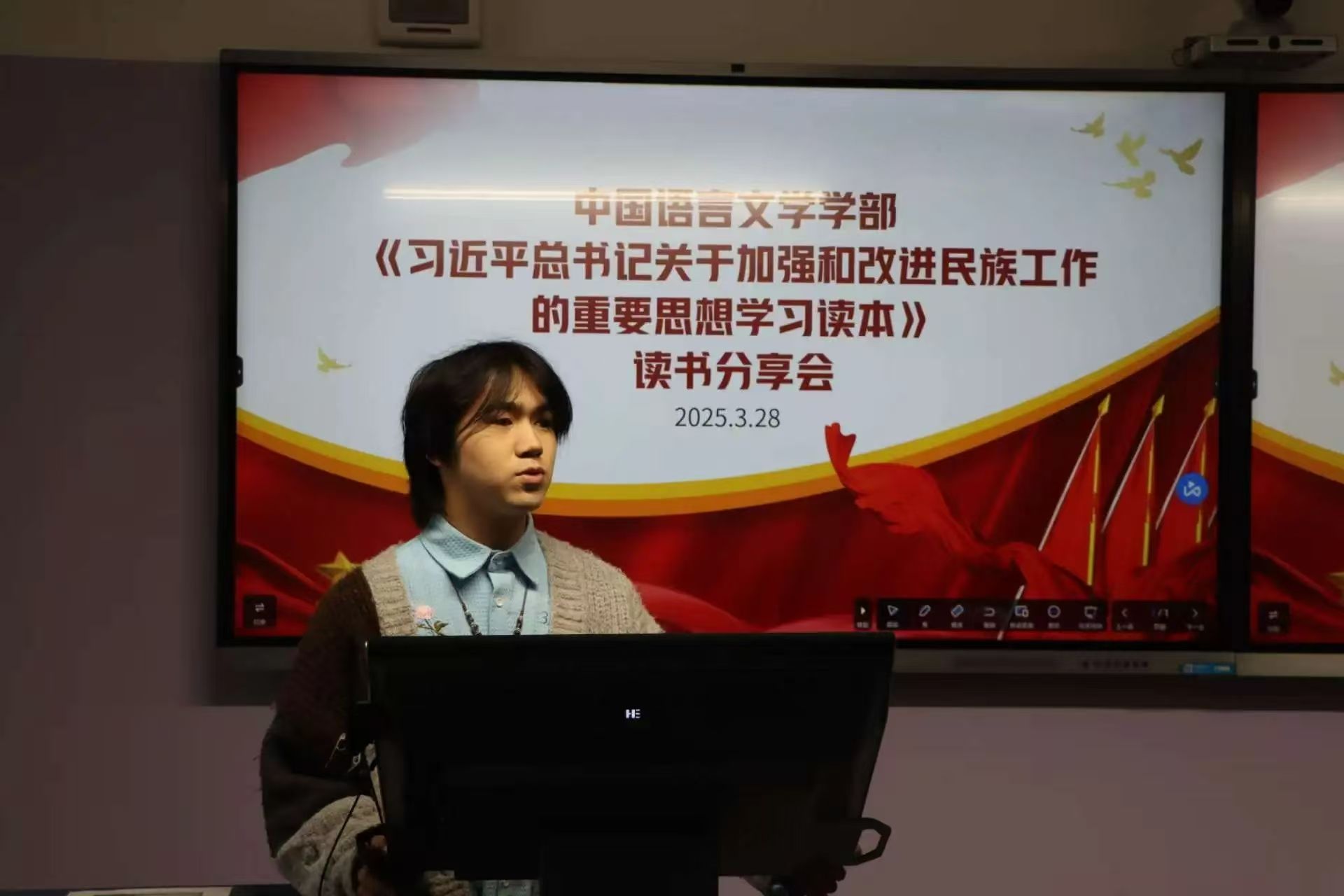 為深入貫徹習近平總書記關于加強和改進民族工作的重要思想,引導同學們深刻領悟鑄牢中華民族共同體意識的豐富內涵,3月28日,中國語言文學學部在博雅樓317教室舉辦了以學習《習近平總書記關于加強和改進民族工作的重要思想學習讀本》為主題的讀書分享研討會。此次活動由魏宇寧同學擔任主持,學部50余名學生代表參與。