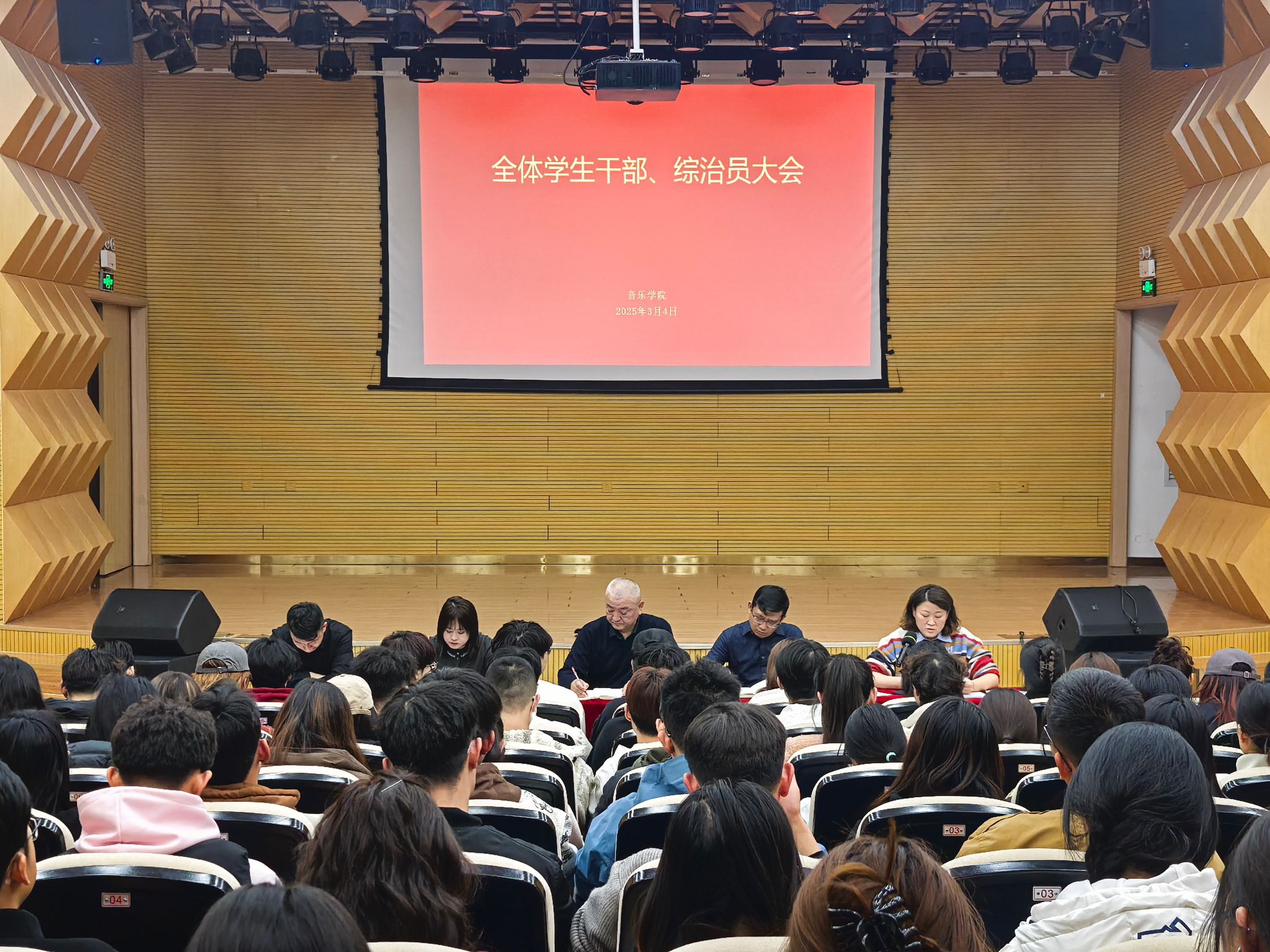 3月4日晚七點,學院在音樂廳召開全體學生干部、綜治員大會。黨委書記白文宏、副書記楊俊、辦公室主任陳瑾、輔導員任嶸、羅佳以及全院學生干部、綜治員參加會議。會議由羅佳主持。
