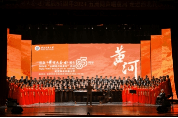 在紀念《黃河大合唱》誕生85周年之際,4月14日晚,2024年“五洲同聲唱黃河”活動走進西北民族大學,與學院師生在學校禮堂同臺演唱《黃河大合唱》。音樂會由上下兩個篇章17個節目組成。上篇開場,學院師生古箏齊奏《盛世國樂》,表達對遠道而來朋友熱烈歡迎之情。臺北黃河合唱團以歌聲和大家分享《黃河大合唱》的人文魅力、氣勢和情懷;法國巴黎之春合唱團、澳大利亞天鵝黃河合唱團表達了黃河兒女濃烈的鄉音鄉情。下篇以紀念《黃河大合唱》首演85周年為主題,四個合唱團聯袂完整演出了《黃河大合唱》的八個樂章。學院青年教師竇鐵民擔任指揮、柳蔚鋼琴伴奏。