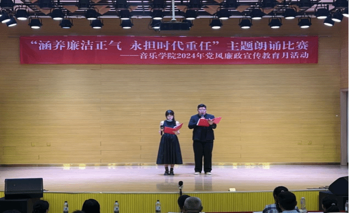 為深入學習習近平總書記在二十屆中央紀委三次全會上的講話精神,推進黨紀學習教育的深入開展,營造風清氣正的學習和育人環境。5月23日晚上,音樂學院舉辦了以“涵養廉潔正氣,永擔時代重任”為主題的朗誦比賽。