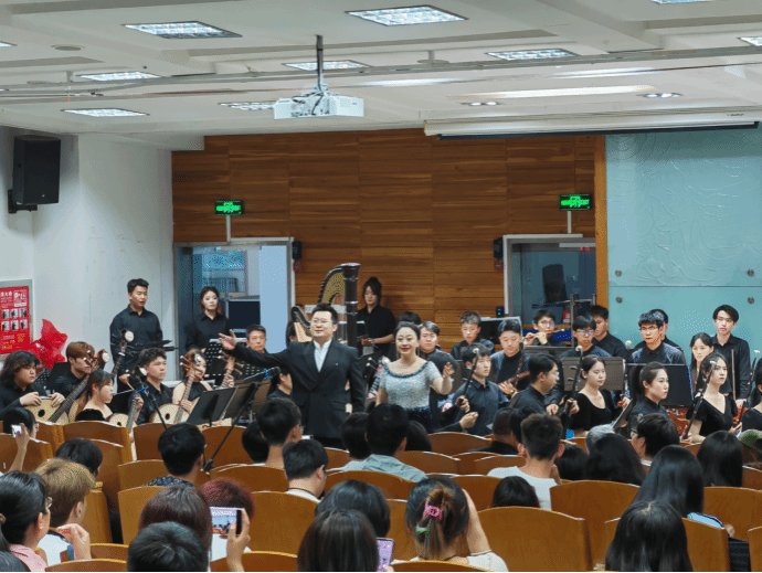 本場音樂會也是融課程思政于經典音樂作品展演的一次探索,指揮管民副教授在開場、曲間和結尾處對每一首音樂作品的創作背景、涵義及其蘊含的文化傳承、民族團結的立意,向同學們做了介紹和宣講,贏得了現場師生的熱情掌聲。通過音樂這一跨越時空的藝術形式,使觀眾們深刻認識到了中華民族文化的博大精深和獨特魅力,增強了師生的民族自豪感和文化自信心。