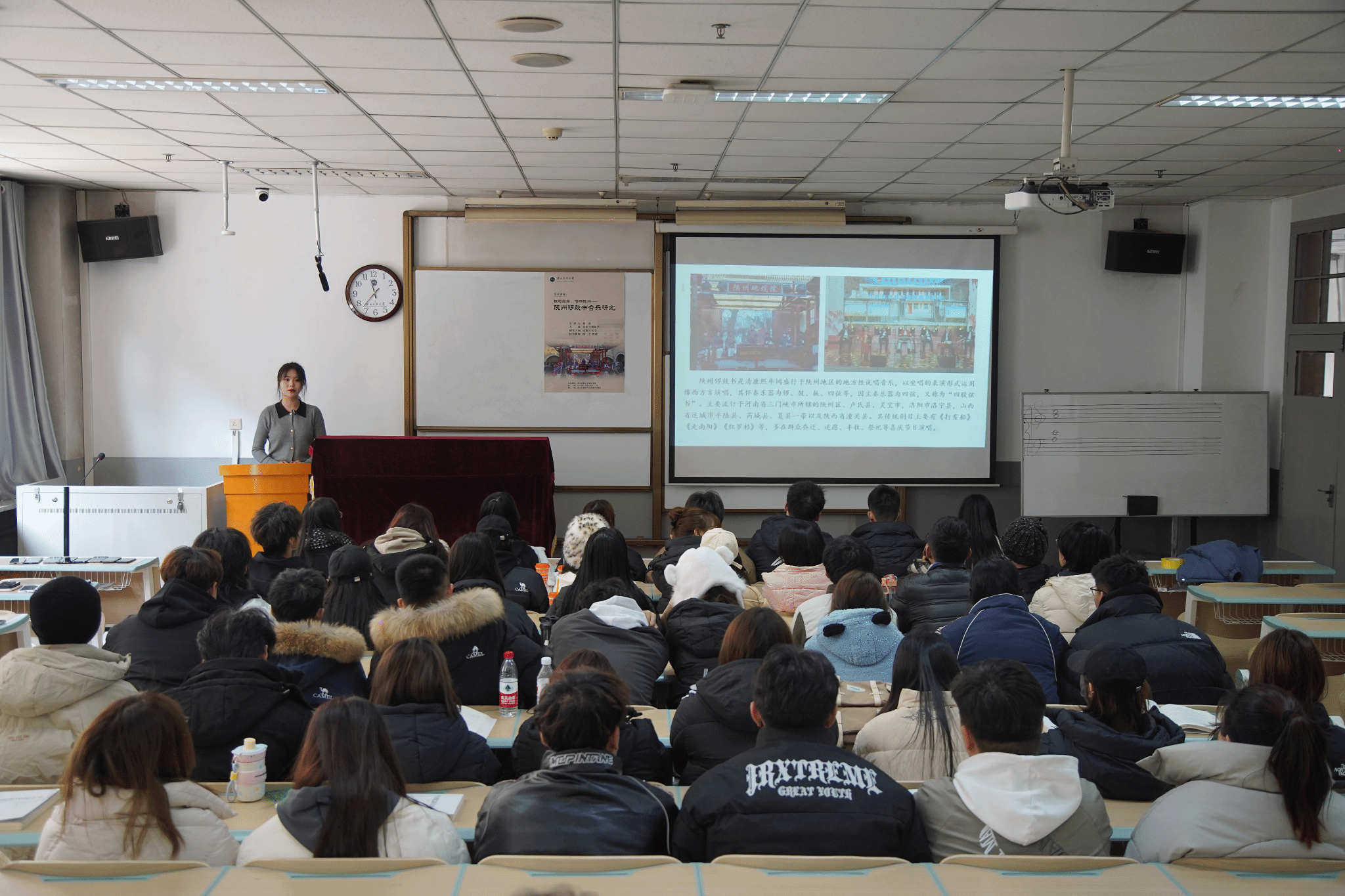 講座歷時40分鐘,講座題目為板起腔落,唱響陜州——陜州鑼鼓書音樂研究。講座內容共分為陜州鑼鼓書的板式運用、陜州鑼鼓書的唱腔運用、陜州鑼鼓書的唱詞解析、陜州鑼鼓書音樂的價值體現四個部分。